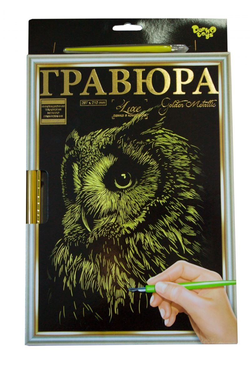 Гравюра "LUXE А4 - Golden Metallic". За допомогою штихеля необхідно провести по контуру малюнка лінії, поступово створюючи зображення. У набір входить: основа з нанесеним контуром, спеціальний штихель (пластикова ручка-гравер з металевим наконечником), дерев'яна рамка, інструкція. Розмір готової роботи: 297 х 210 мм.