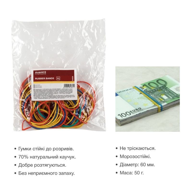 Гумки для грошей використовуються не тільки для скріплення купюр, а й виручають у багатьох інших сферах - для перетягування невеликих упаковок, пакетів, для фасування дрібних речей, канцелярських товарів, для зберігання креслень, плакатів, для фасування ліків та ін. Гумки для грошей використовуються в банках, в офісах, на виробництві, на пошті, в аптеках, в торгівлі, в побуті. Гумки Delta by Axent зроблені на 70% з натурального каучуку, якісно порізані, мають однаковий діаметр і товщину, не мають неприємного запаху, не залишають неприємного відчуття на руках. Діаметр гумки 60 мм.