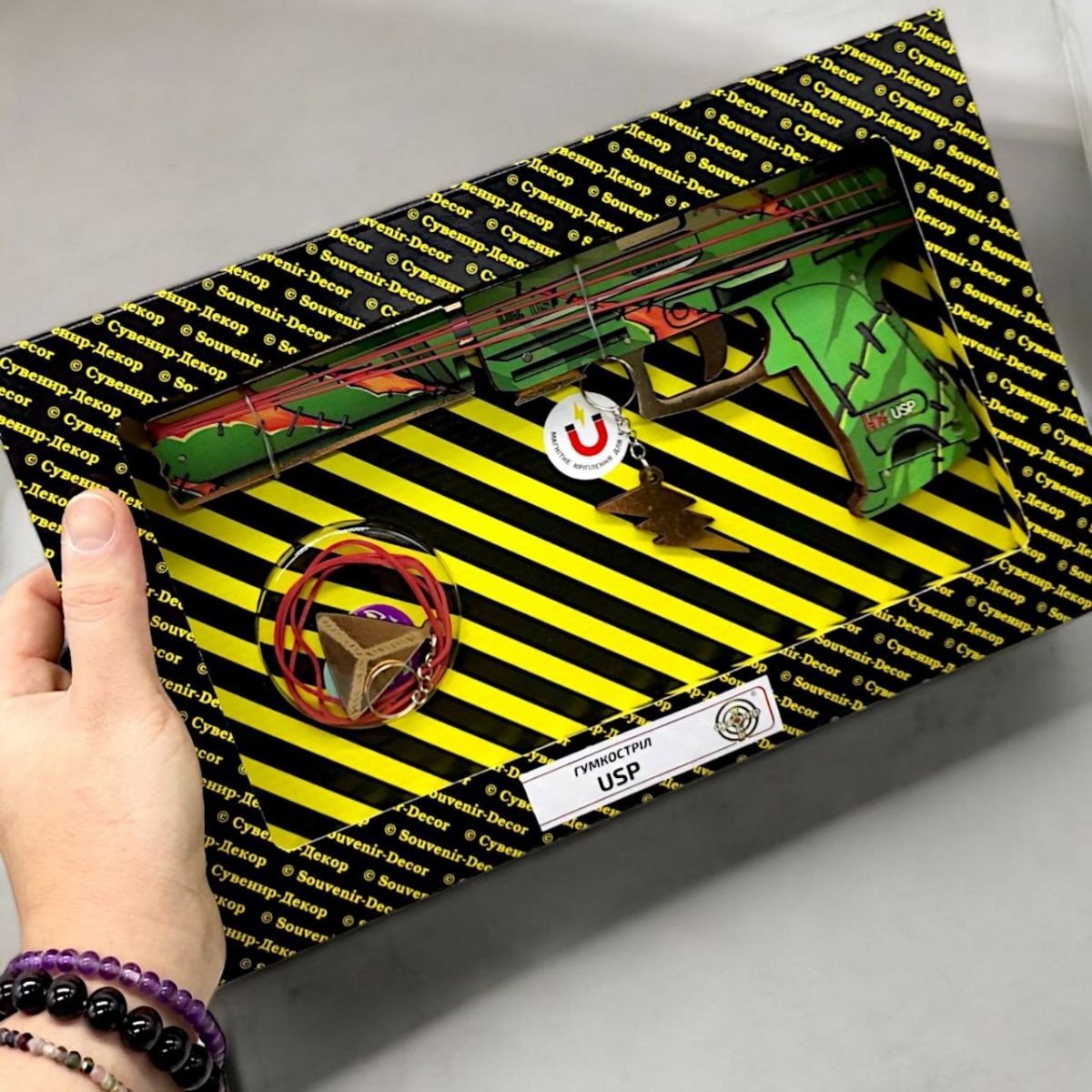 Дерев`яний пістолет у зібраному вигляді. Усі деталі продумані та виконані з екологічних матеріалів. Іграшка стріляє гумками для грошей (гумки є в комплекті), для них також є зручне кріплення на пістолеті. У набір також входять два брелоки та наклейки. Розмір зброї 24х14х1 см. Аксесуари можуть трохи відрізнятись від представлених на фото.