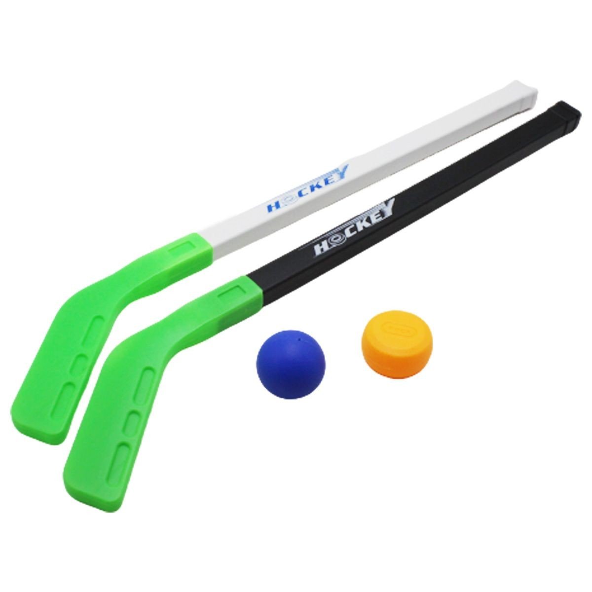 Дитячий хокейний набір для гри. Складається з двох ключок, шайби і кульки. Поставляється в сітці.