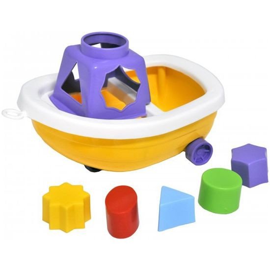 Яскрава пластикова іграшка поєднала у собі два елементи - гарну іграшку та сортер. Кораблик на коліщатках, до нього можна прив'язати мотузку і возити за собою. На каюті розташовані отвори як різних геометричних фігур. У комплекті є 5 елементів сортера різних кольорів та форм. Розмір корабля 11х20х13 см.