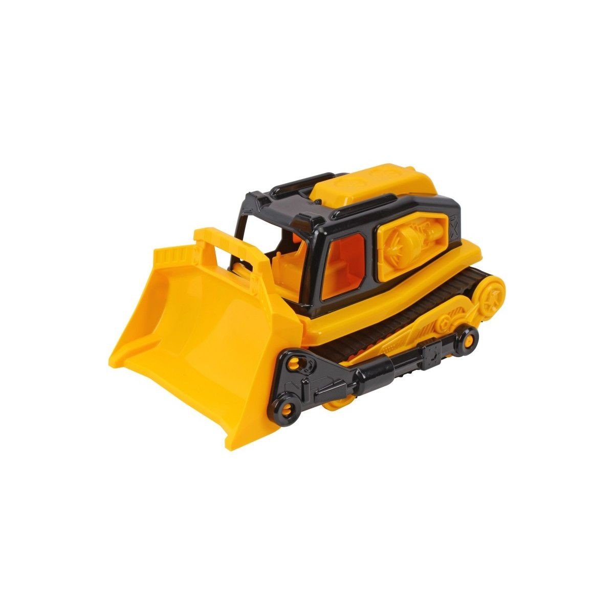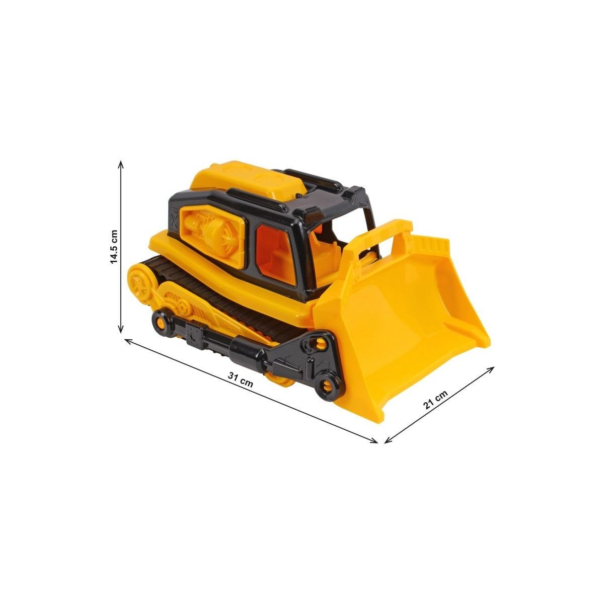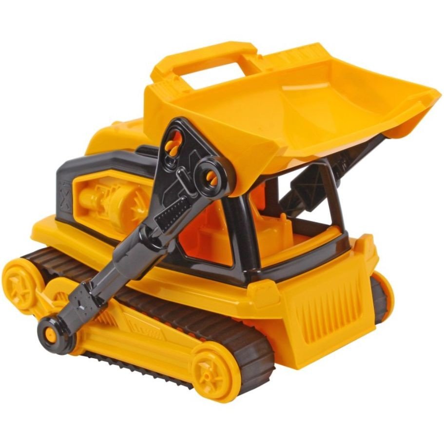 Пластикова машинка-бульдозер, створена для маленьких будівельників, вражає своїм реалістичним дизайном та потужним функціоналом. Вона оснащена величезним ковшем, який легко піднімається та фіксується у верхньому положенні над кабіною, дозволяючи дитині моделювати справжні будівельні роботи. Гумові гусениці надають іграшці стійкість та відмінну прохідність на будь-яких поверхнях.