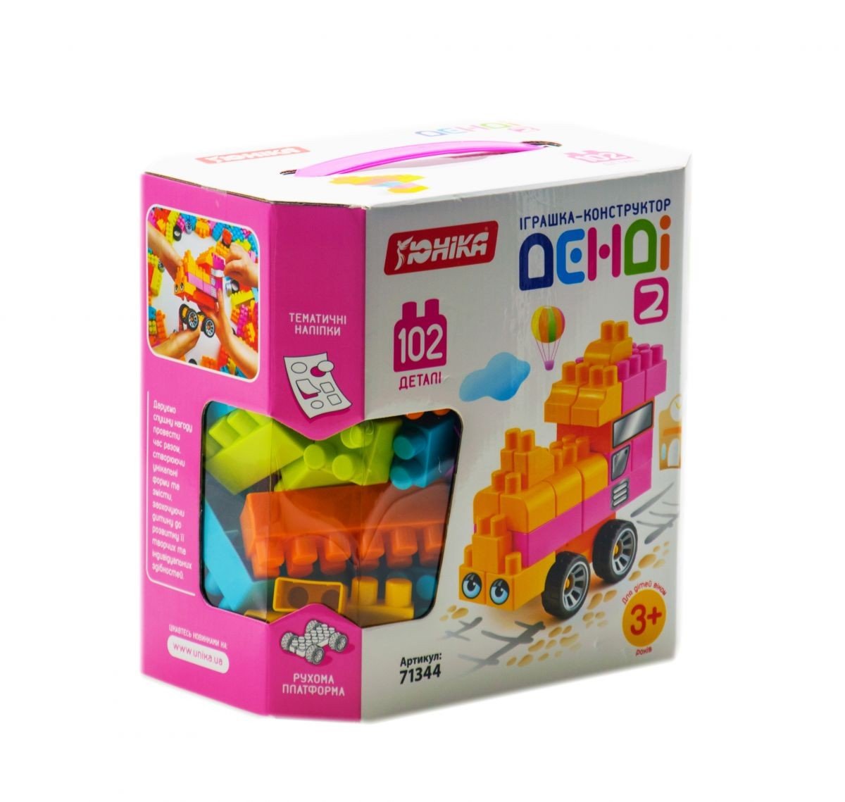 Бренд: Unika Упаковка: Коробка Колір: Різнобарв'я Вага з упаковкою: 805 г Габарити в упаковці: 23 x 22.5 x 16 см Габарити без упаковки: 23 x 22.5 x 16 см Країна виробник: Україна Матеріал: Пластик Комплектація: 102 дет.