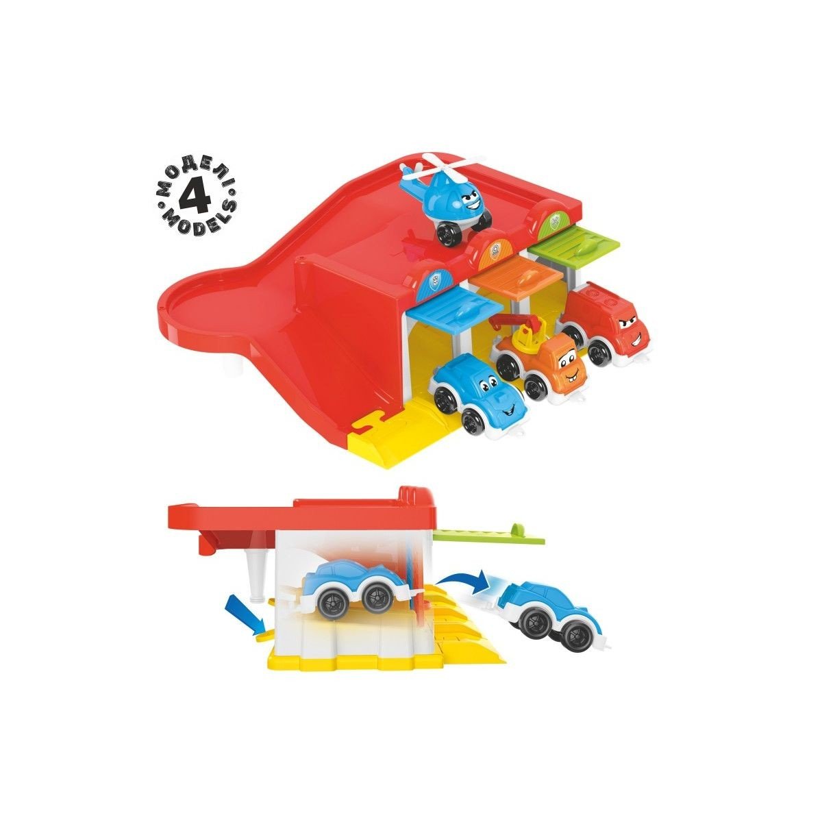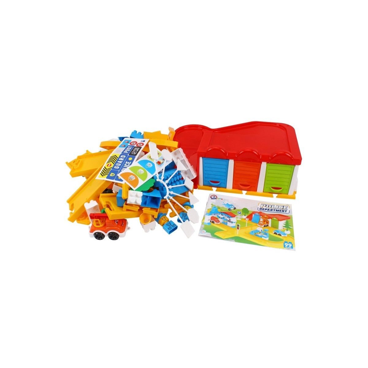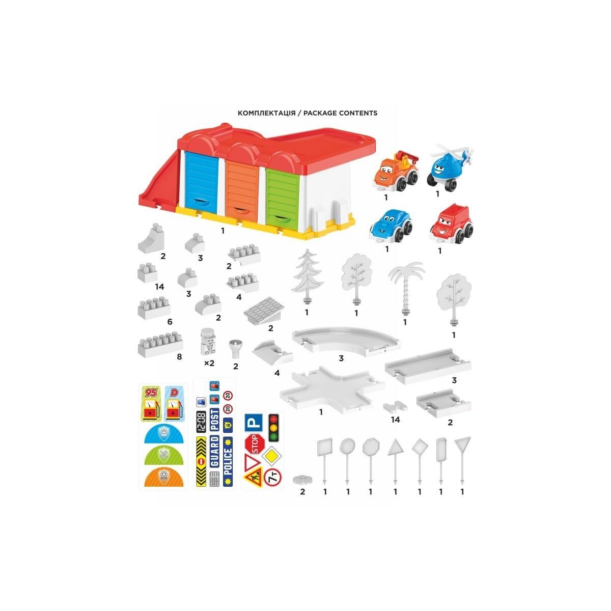 Іграшка-конструктор, що включає різноманітні елементи для захопливої гри. У комплекті є три машинки та гелікоптер, а також фігурки полісменів, гоночна траса, дерева, дорожні знаки та інші деталі. Основною особливістю є кольорові гаражі для кожного автомобіля та посадкова зона для гелікоптера на даху паркінгу. Гараж має функцію автоматичного виїзду машинок при натисканні на педаль, а також крутий спуск, що додає інтерактивності та динаміки в гру.