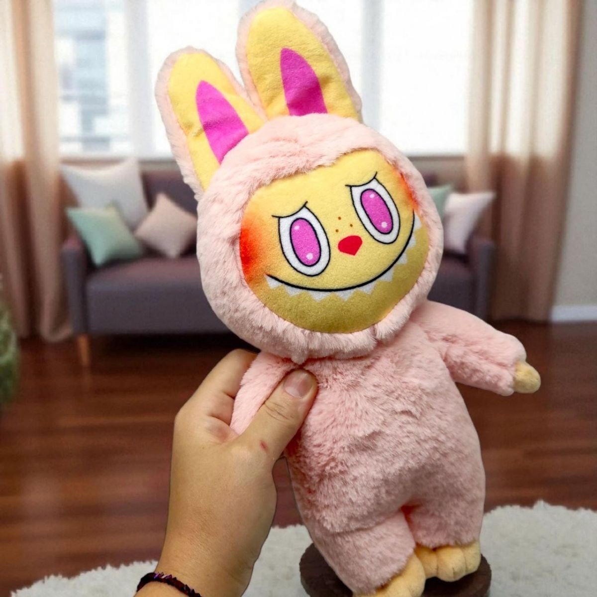 М’яка іграшка Лабубу, наймирніший монстрик у світі, стане чудовим другом для прогулянок. Розмір іграшки - 33 см. У серії присутні різноманітні забарвлення. Виготовлена зі штучного хутра, має синтетичний наповнювач та пластмасову фурнітуру. Приємний на дотик, дуже мʼякенький!