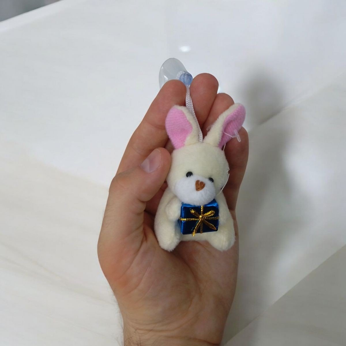 Чарівна іграшка на присосці у вигляді маленького кролика з подарунком. Іграшку можна прикріпити до скла, дзеркала або будь-якої іншої гладкої поверхні. Виконано з якісних та міцних матеріалів. Розмір зайчика: 8 х 5 х 5 см. Різні кольори в асортименті.