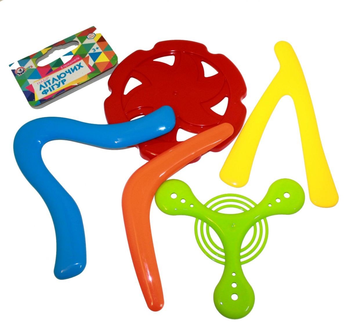 Бренд: Технок Колір: Різнобарв'я Вага з упаковкою: 190 г Габарити в упаковці: 32 x 30 x 4 см Країна виробник: Україна Матеріал: Пластик Комплектація: 2 літаючих диска, 3 бумеранга