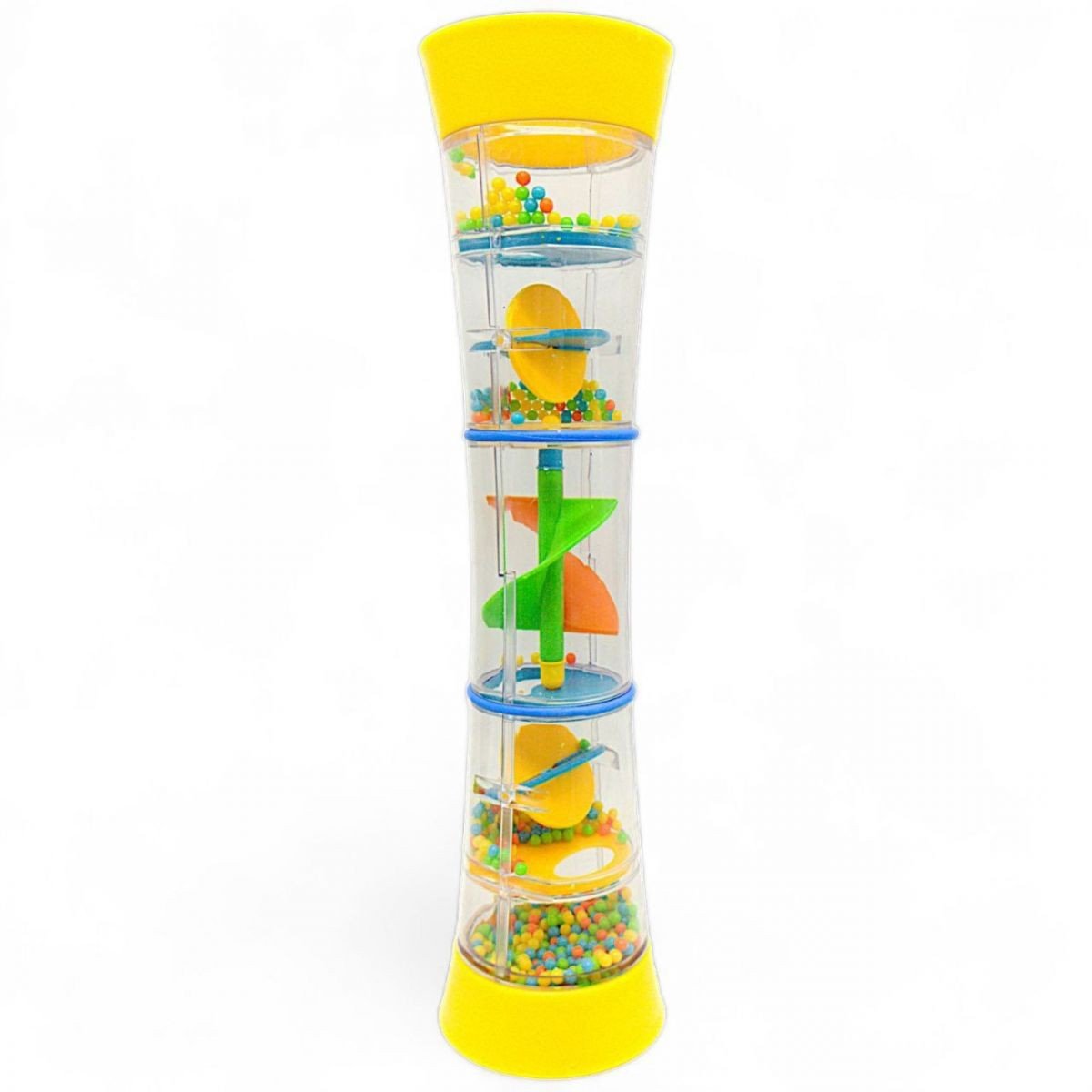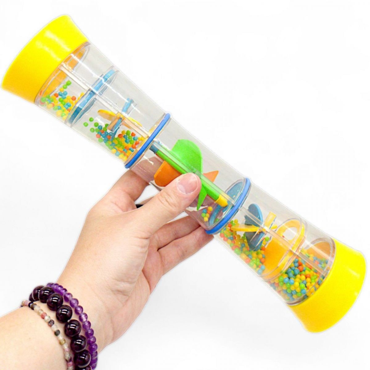 Іграшка "Райдужна паличка". Прозора, закрита з обох сторін колба. Усередині колби знаходиться спіралька, по якій пересипаються маленькі кульки. Іграшка видає звуки, що віддалено нагадують шум дощу. Розмір - 30х6х6 см. Виконана з якісного пластику. Для дітей від 3-х років.