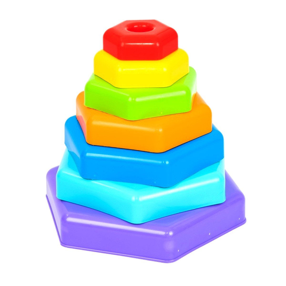 Іграшка "Райдужна пірамідка". Складається з 7 елементів різного розміру і кольору, які накладаються один на одного. В ході гри дитина знайомиться з формами і розмірами предметів, вчиться просторово мислити, розпізнавати кольори, вивчає кількісний рахунок.