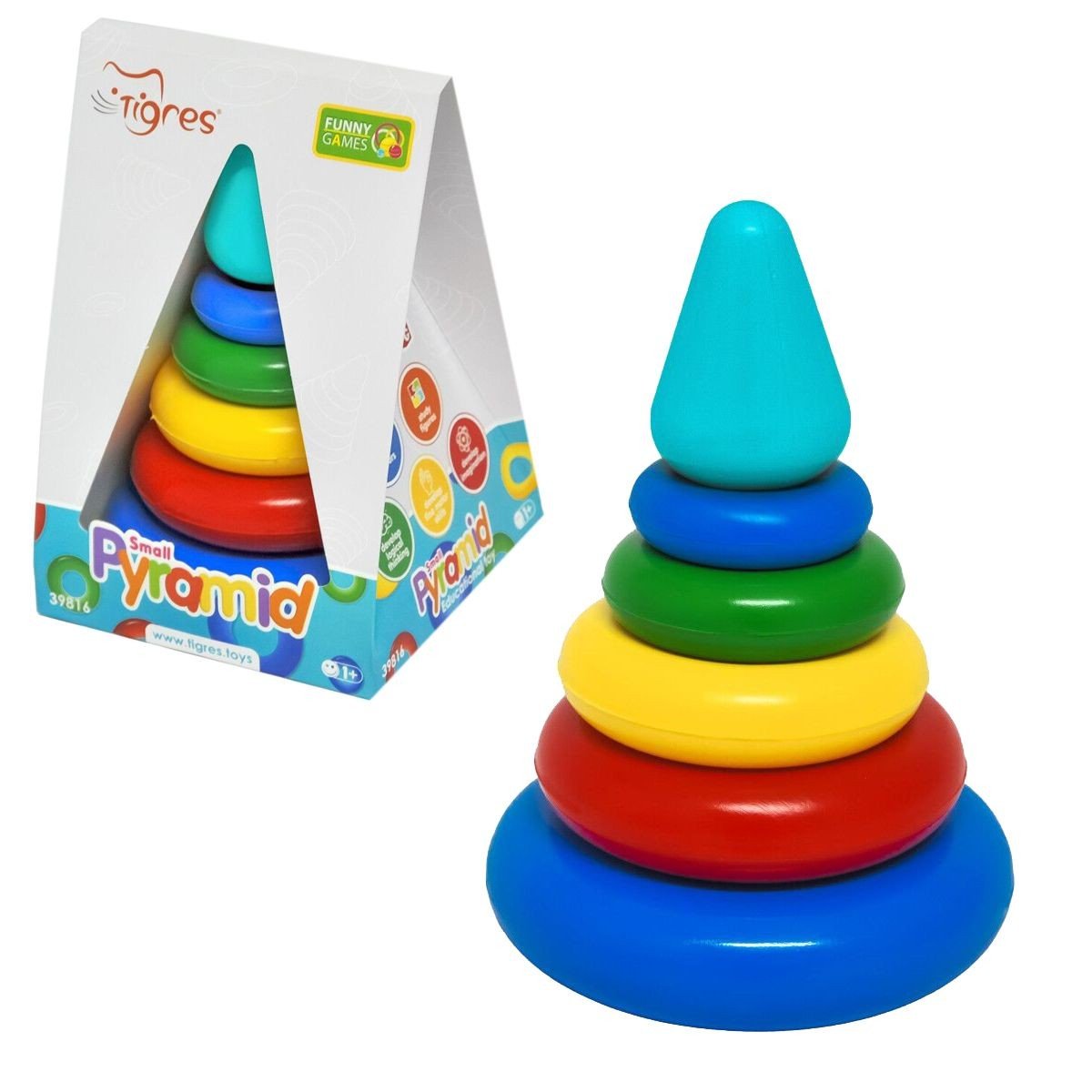 Яскрава пластикова іграшка "Пірамідка". Гра складається з основи, 5 різнокольорових, кілець різного розміру та трикутника-верхівки. Гра з пірамідкою розвиває посидючість, логіку, дрібну моторику та увагу. Висота іграшки 20 см. Зроблена з безпечних і якісних матеріалів. Для дітей від року.