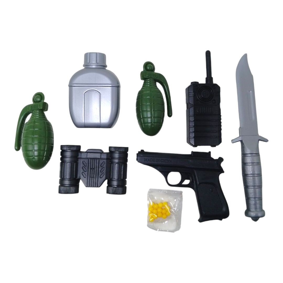 Іграшкова зброя - пістолет, 2 гранати, рация, бінокль, фляга, ніж, пульки, у сітці