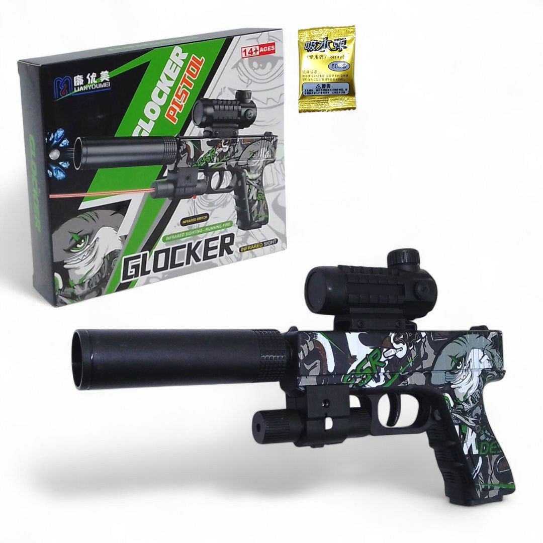 Іграшковий пістолет з орбізами (гідрогель) – дитяча зброя для активних ігор. Оснащений глушником та лазерним прицілом для більш точного прицілювання та реалістичності. У комплект входять орбізи (гідрогелеві кульки), які необхідно замочити у воді до збільшення розміру. Ідеально підійде для вуличних баталій та веселих пригод з друзями.