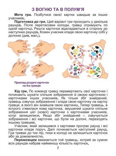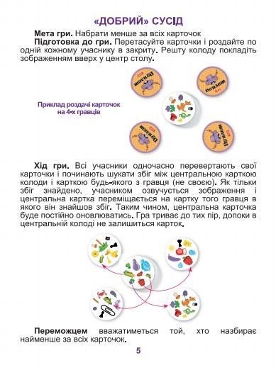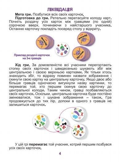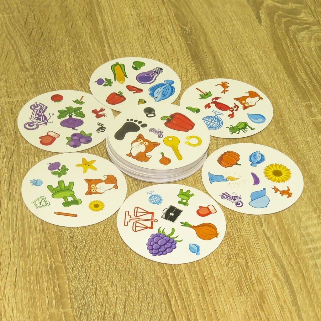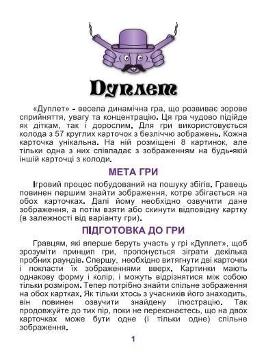 Ігри "Дуплет". Ігровий процес побудований на пошуку збігів. Картинки розділені на групи. У кожній групі є одна картинка, що збігається з картинкою на іншій картці з колоди. Мета гри - знайти картку з збігається картинкою, вимовити вголос, що на ній намальовано і забрати собі, як переможний трофей. - картонна коробка-упаковка - 57 круглих карток - інструкція з правилами гри. У тубі.