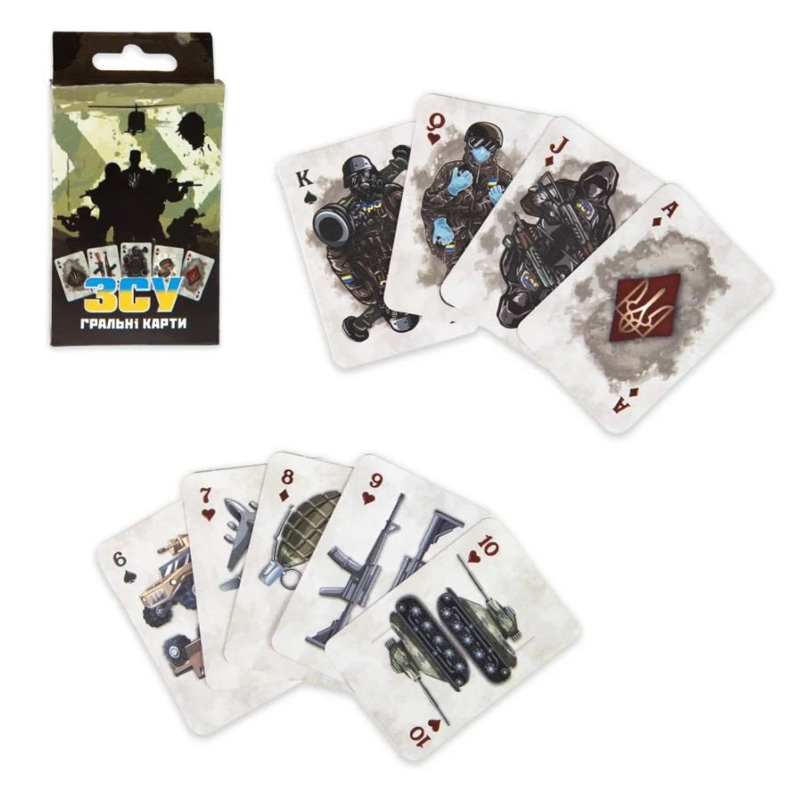 Незвична колода карт у військовій тематиці. На картах зображені різні види зброї та військові. З ними можна грати в такі популярні ігри, як "Дурак" та "Косинка", а також розкладати різноманітні пасьянси. Колода на 36 карт. Виконані з картону. Розмір - 5,5 х 7,5 см.