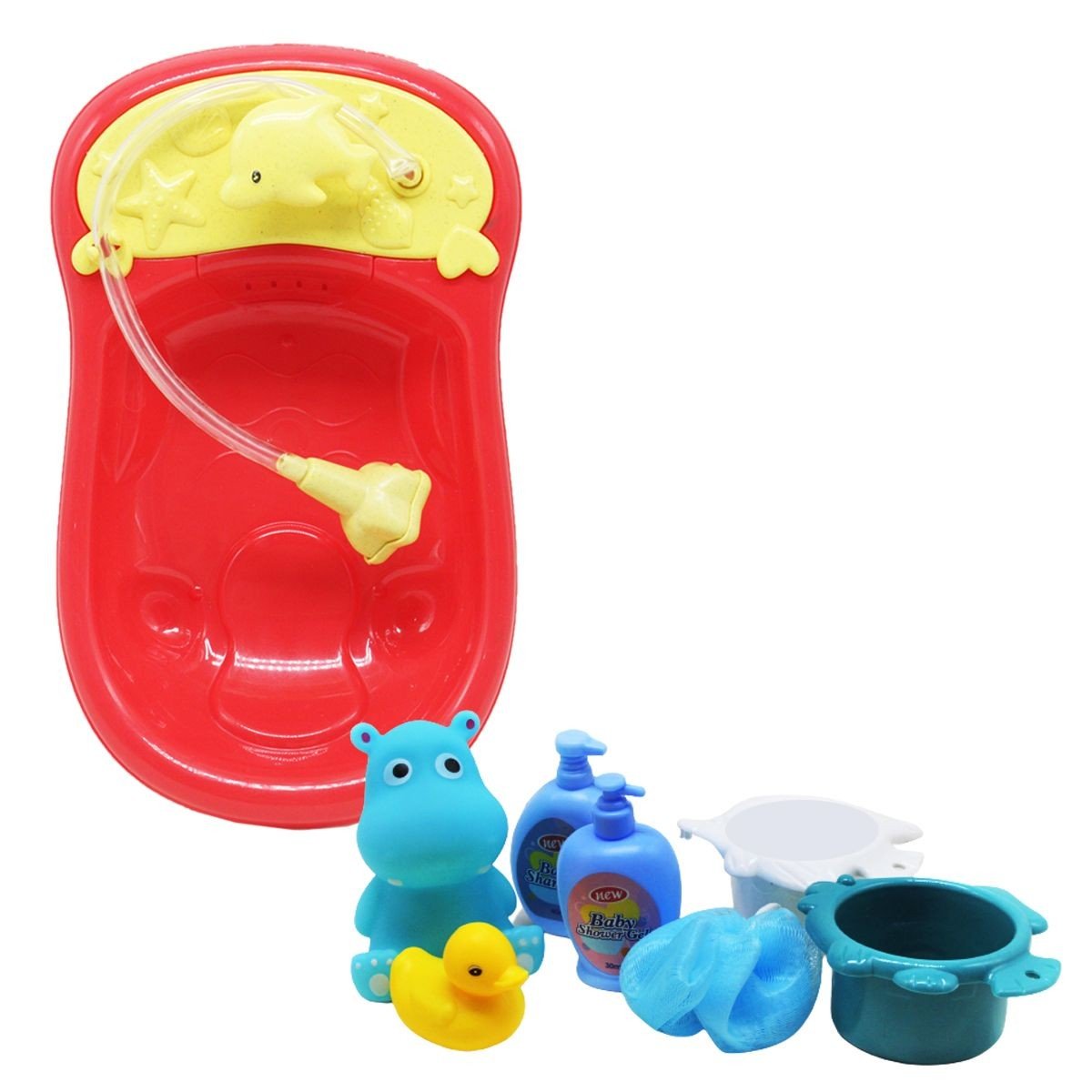 Бренд: MIC Упаковка: Пакет Колір: Червоний Вага з упаковкою: 230 г Габарити в упаковці: 5 x 18 x 27 см Габарити без упаковки: 4 x 18 x 27 см Країна виробник: Китай Матеріал: Пластик Комплектація: Ванна, бегемотик, качка, гель для душу, 2 сита для води, мочалка.