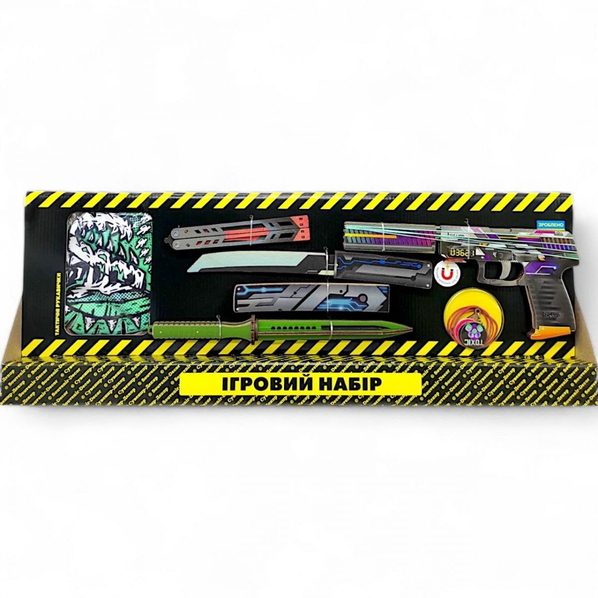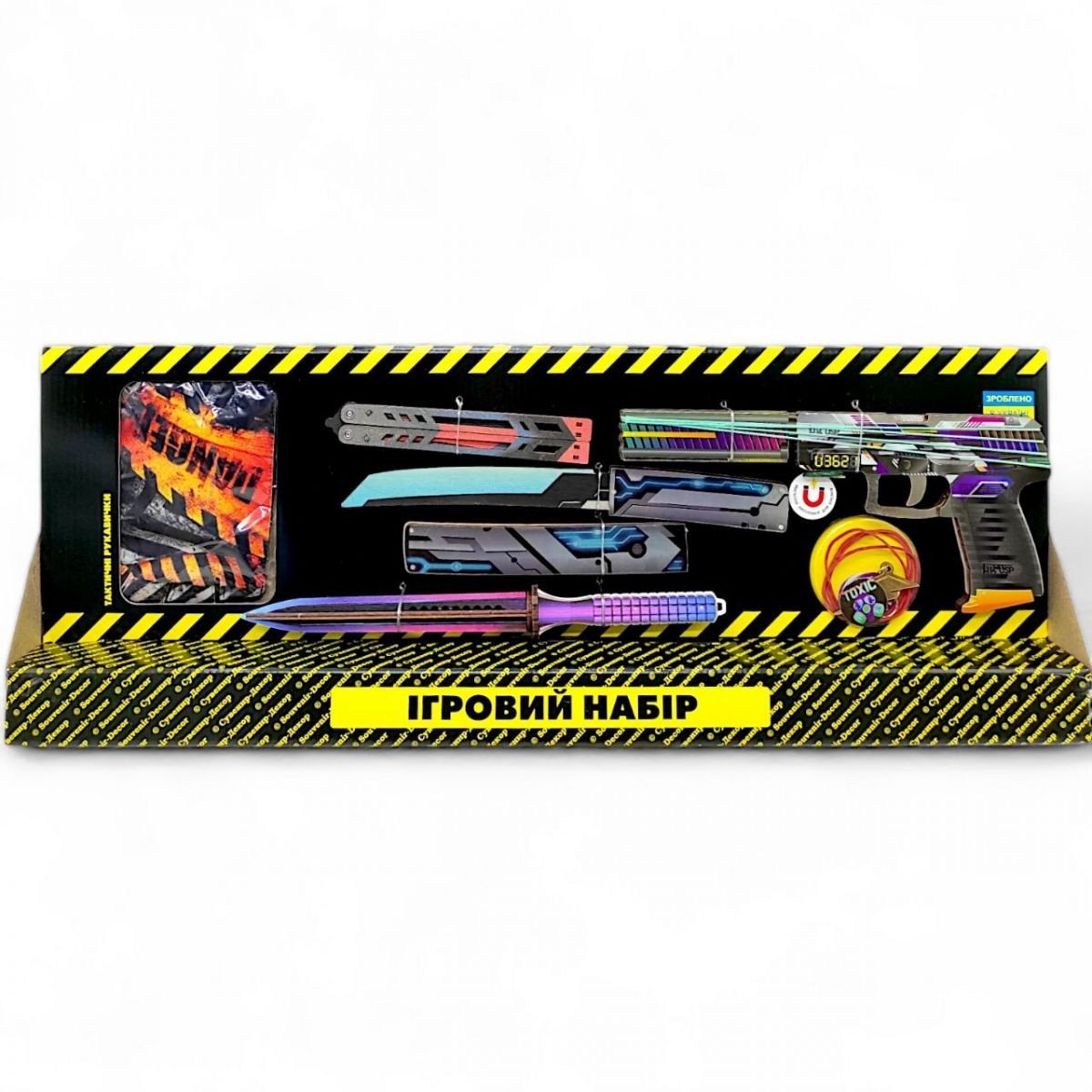 Дитячий ігровий набір "BIG BOX" - ідеальне рішення для любителів активних ігор та безпечних баталій! Особливо набір сподобається фанатам ігор CS:GO та Counter-Strike 2. У комплект входять: деревʼяний резинкостріл (гумкостріл) з резинками, тренувальні сувенірні ножі, тактичні рукавички та стильний брелок. *Забарвлення може відрізнятися від вказаного на фото.