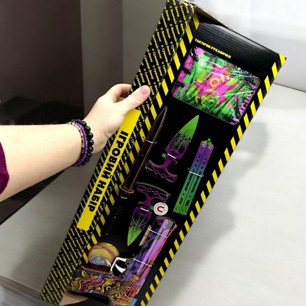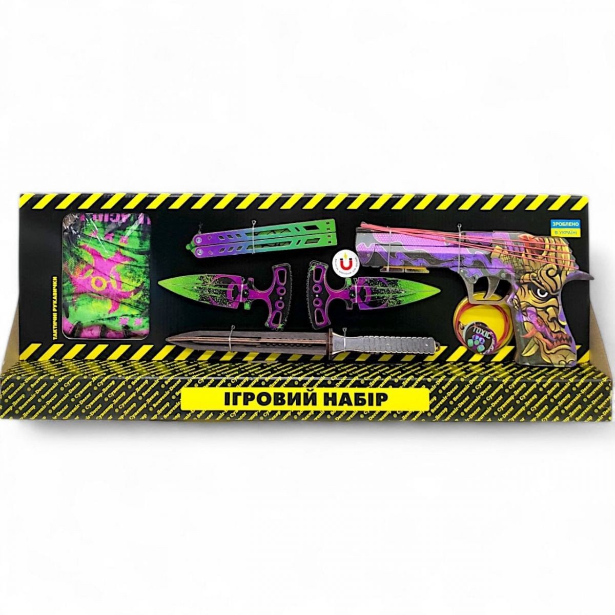 Дитячий ігровий набір "BIG BOX" - ідеальне рішення для любителів активних ігор та безпечних баталій! Особливо набір сподобається фанатам ігор CS:GO та Counter-Strike 2. У комплект входять: деревʼяний резинкостріл (гумкостріл) з резинками, тренувальні сувенірні ножі, тактичні рукавички та стильний брелок. *Забарвлення може відрізнятися від вказаного на фото.