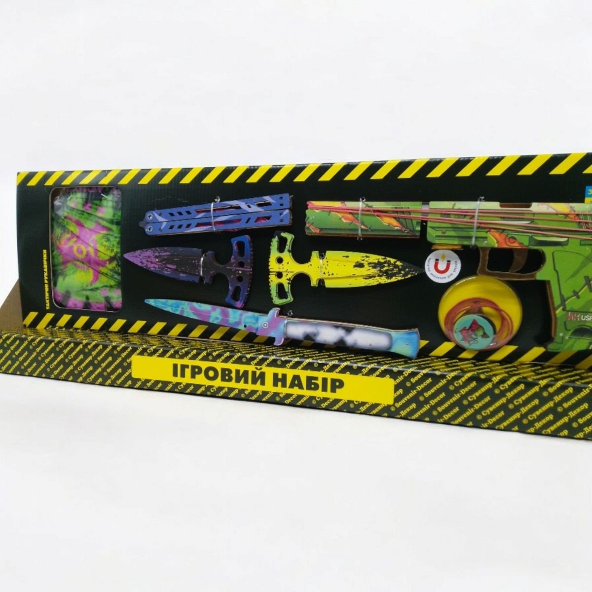 Дитячий ігровий набір "BIG BOX" - ідеальне рішення для любителів активних ігор та безпечних баталій! Особливо набір сподобається фанатам ігор CS:GO та Counter-Strike 2. У комплект входять: деревʼяний резинкостріл (гумкостріл) з резинками, тренувальні сувенірні ножі, тактичні рукавички та стильний брелок. *Забарвлення може відрізнятися від вказаного на фото.