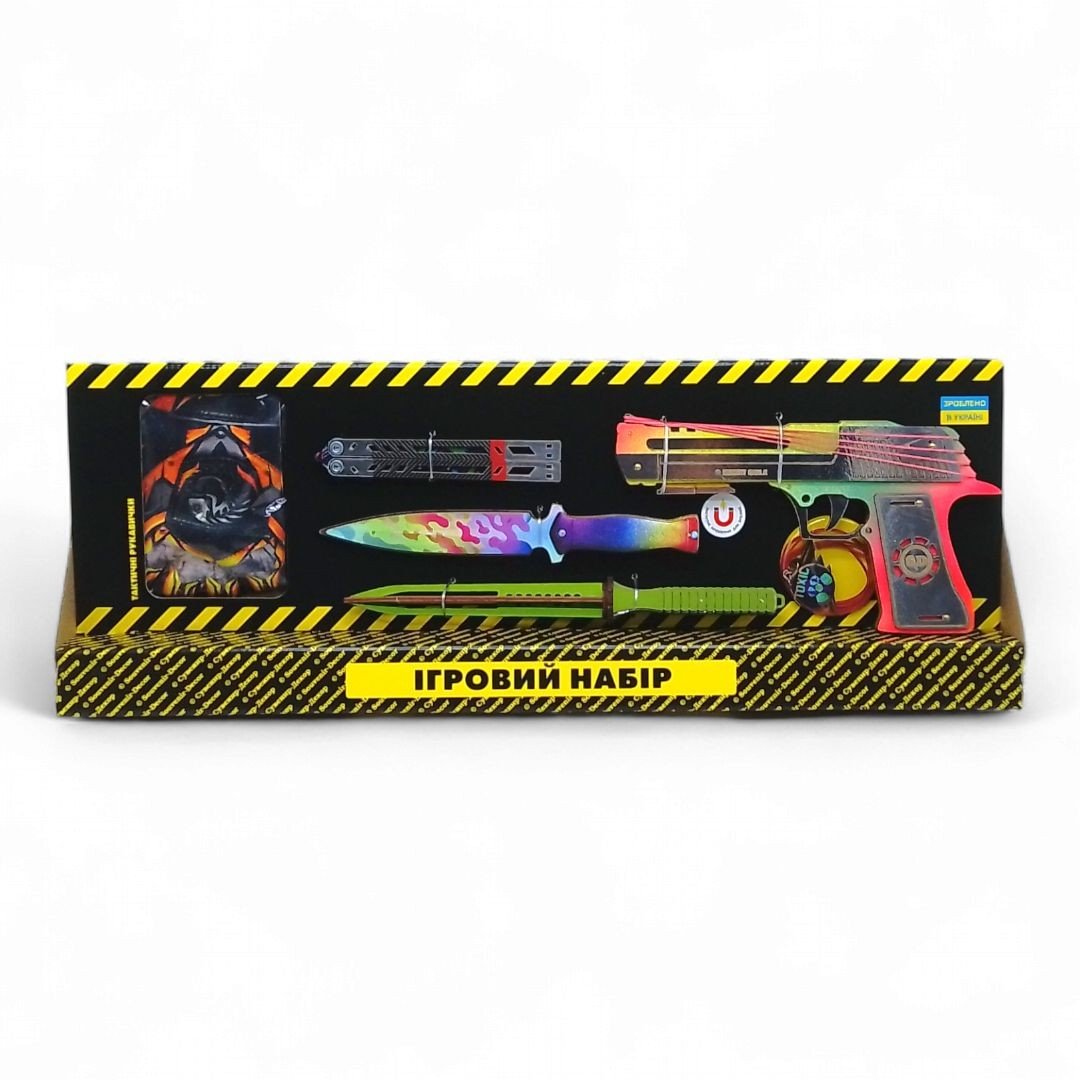Дитячий ігровий набір "BIG BOX" - ідеальне рішення для любителів активних ігор та безпечних баталій! Особливо набір сподобається фанатам ігор CS:GO та Counter-Strike 2. У комплект входять: деревʼяний резинкостріл (гумкостріл) з резинками, тренувальні сувенірні ножі, тактичні рукавички та стильний брелок. *Забарвлення може відрізнятися від вказаного на фото.