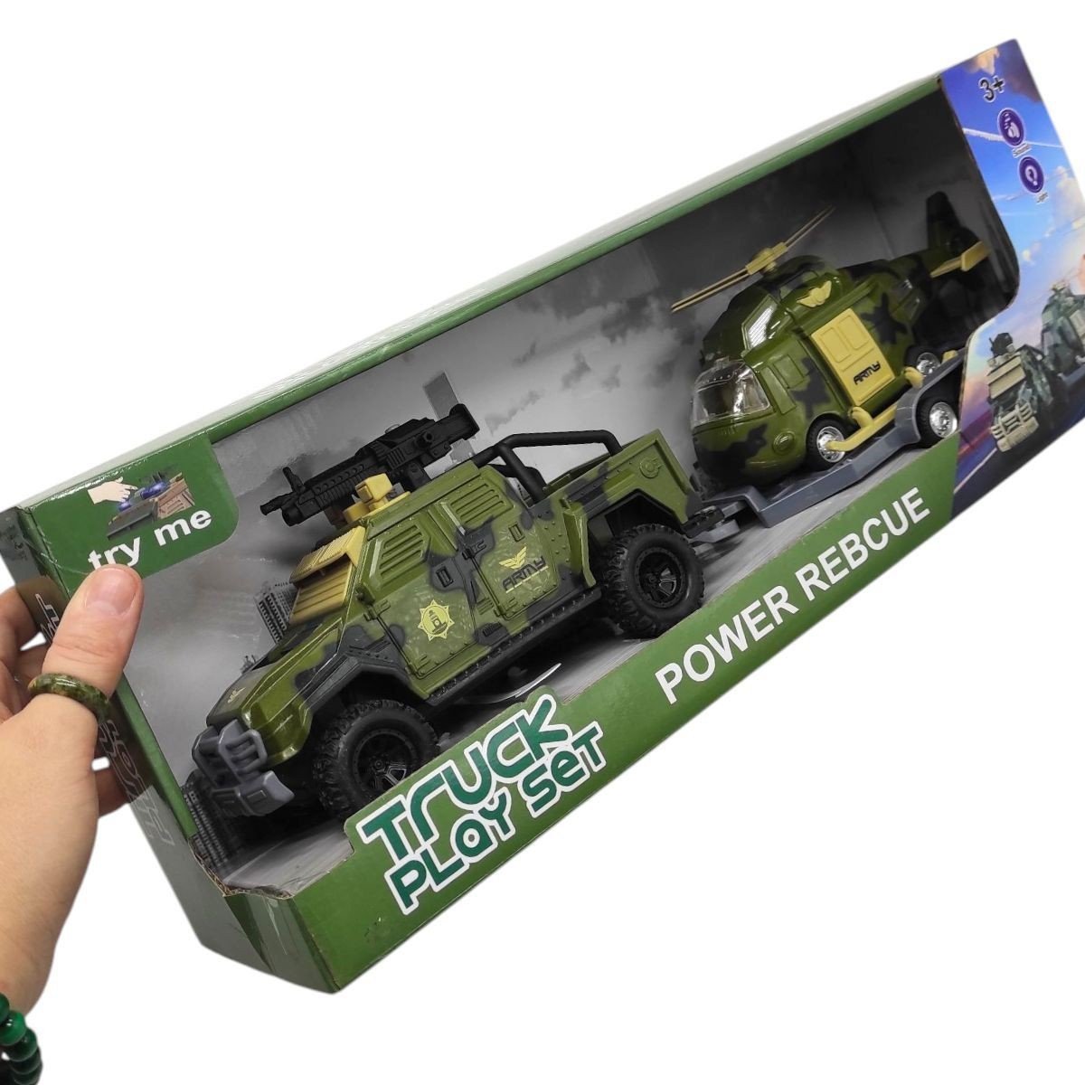 Опис Ігровий набір "БТР з ГЕЛІКОПТЕОРОМ НА ПРИЧЕПІ" (ЗЕЛЕНИЙ) кор. 47х11,5х16,5 см