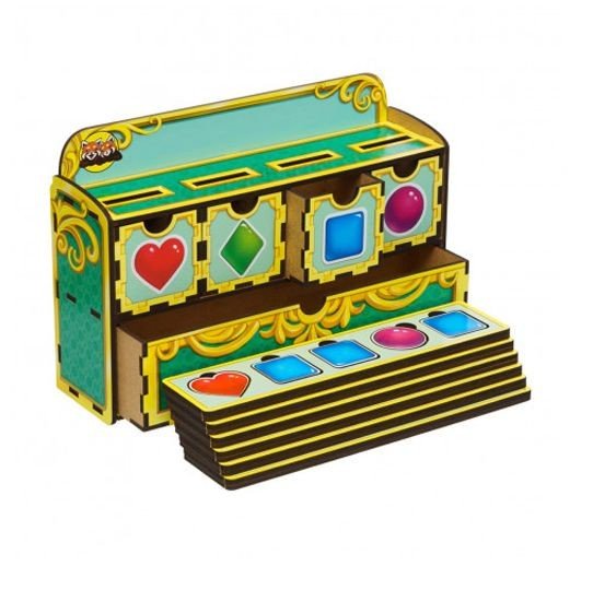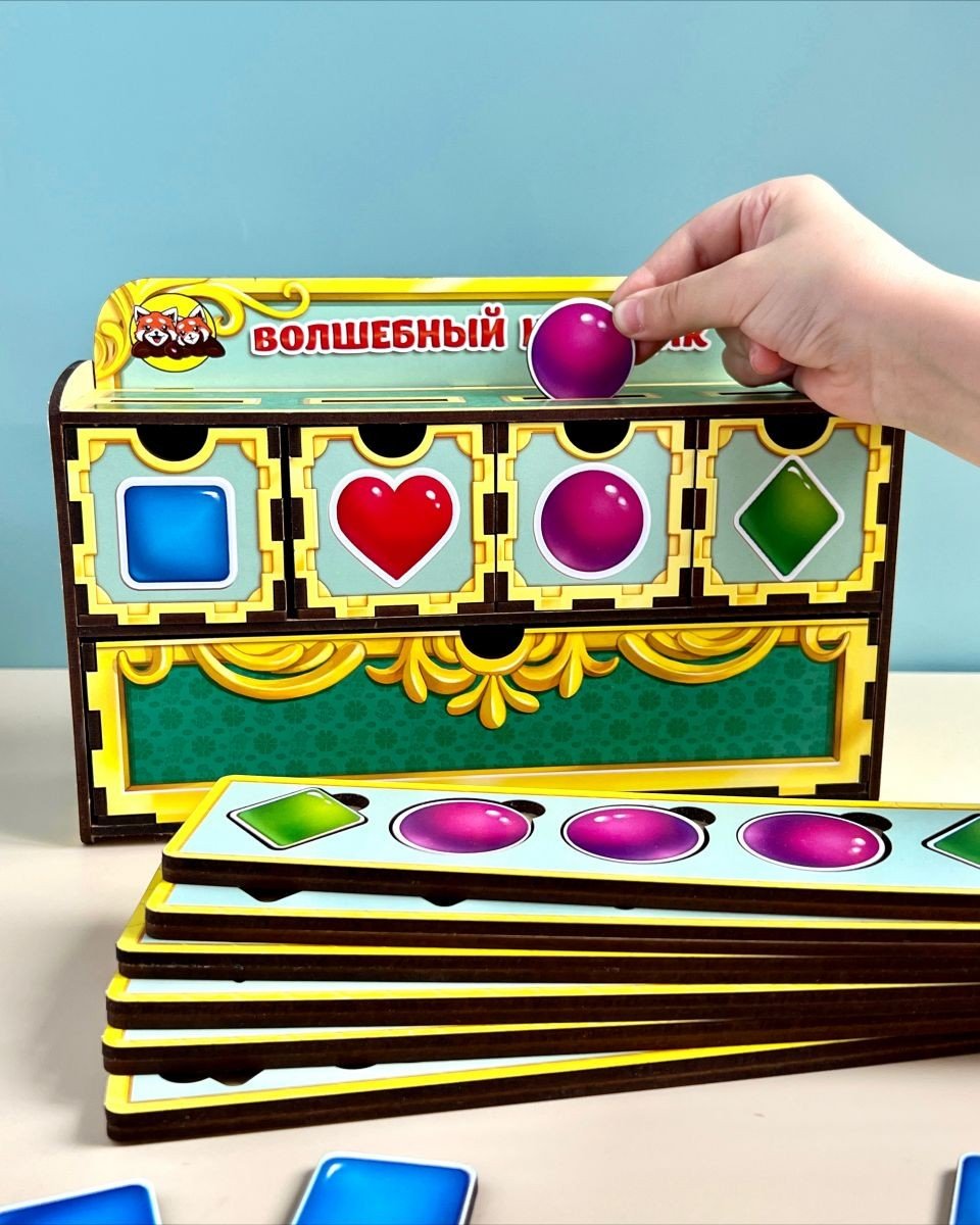 Ігровий набір "Чарівна скринька" буде прекрасним подарунком. Являє собою комод з 4 ящиками для сортування вкладишів і 1 ящиком, де знаходяться рамки для вкладишів. У комплекті 5 рамок і 25 вкладишів.