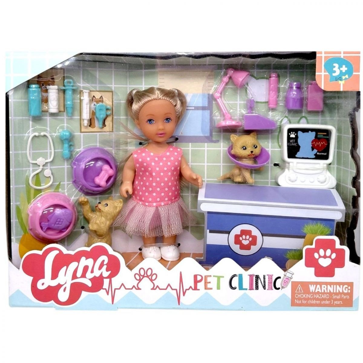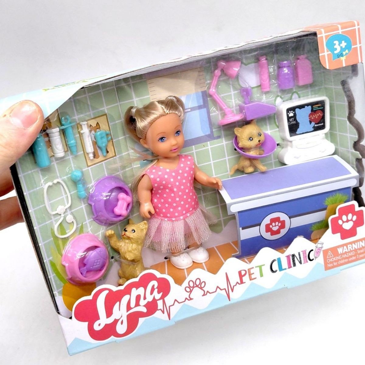 Ігровий набір "Лялечка у ветклініці". У комплекті є маленька лялечка (11,5 см.), дві собачки, дві миски з їжею та інструменти ветеринару. Виконано з якісного та міцного пластику. Для дітей віком від 3-х років.