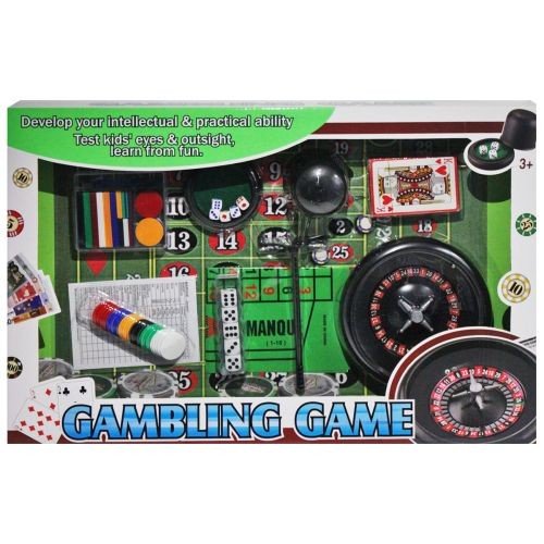 Великий ігровий набір – міні версія справжнього казино. У набір входить рулетка, кубики (маленькі та великі), чашка для кубиків, лопатка, фішки та гральні карти. На упаковці зображено ігрове поле, яке можна вирізати та використовувати у грі.
