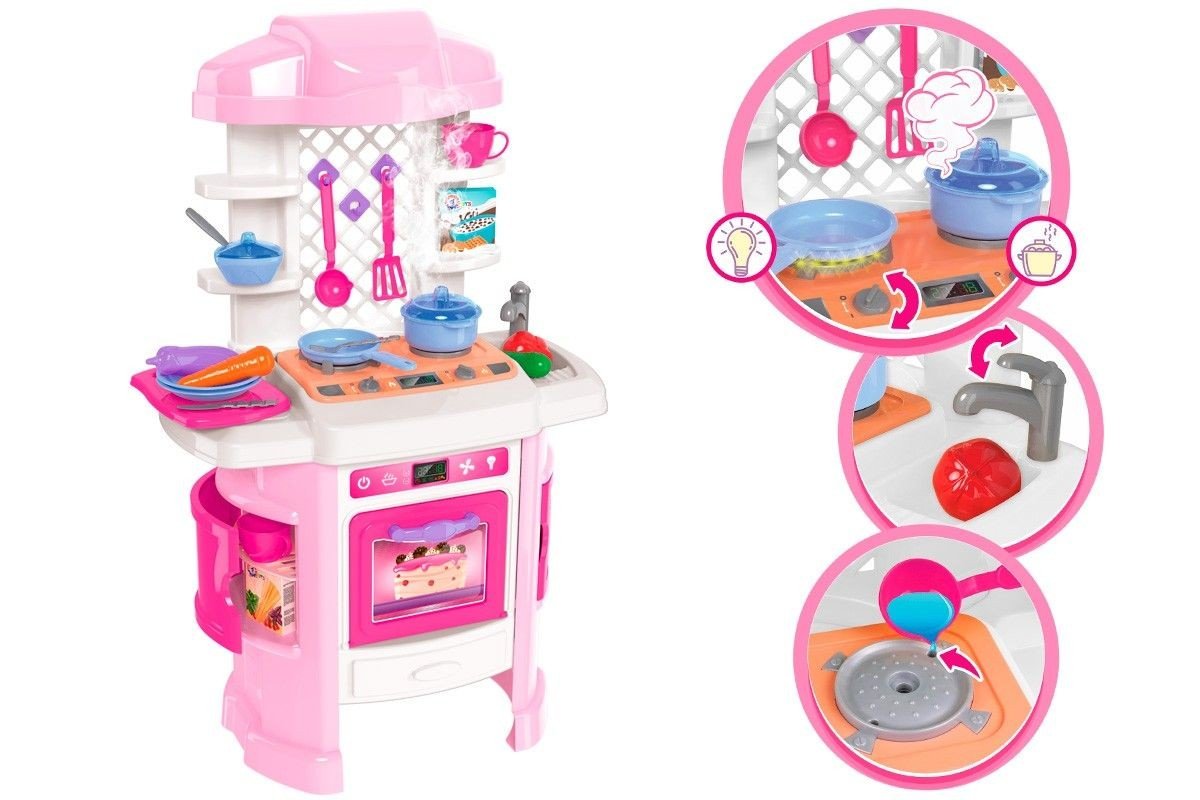 Ігровий набір "Кухня" буде цікавим подарунком дитині. Являє собою конструкцію зі столиком, плитою, мийкою, духовкою і поличками для посуду. Так само, в наборі є: продукти (6 шт.), Доточка (1 шт.), Каструлька (1 шт.), Сковорідка (1 шт.), Чашечка з блюдцем (2 шт.), Тарілочка (2 шт.) , кухонні (4 шт.), і столові (6 шт.) прилади. Є світлові і звукові ефекти (світяться елементи на плиті і духовці, шум, звук кипіння). Коли в каструльці що то готується - йде пар (холодний і повністю безпечний для дитини). Розмір конструкції в зібраному вигляді - 51х81х30 см. Виконана з якісного пластику. Для дітей від 3-х років.