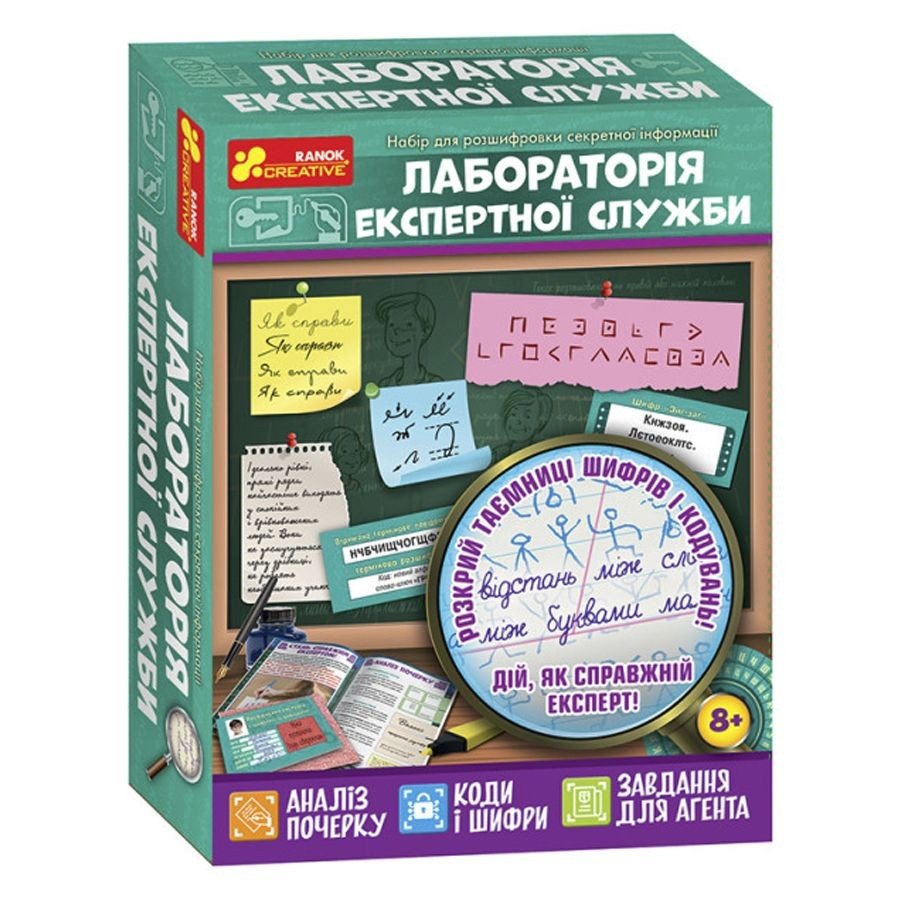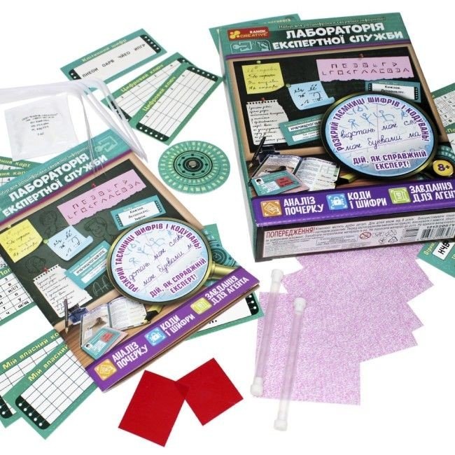 Комплектація: Червона плівка, клей ПВА, папір для шифрування, шифрувальне колесо, кольорові шифрувальні аркуші, капсули для шифрування, картка "Квадрат Полібія", картка "Шифрування карт", картка "Цифровий ключ", картка "Піг-пен", картка "Мій власний код", посвідчення експерта, картки із завданнями, довідник експерта з графології та шифрування.