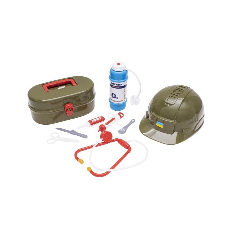 Бренд: Orion Упаковка: Сітка Колір: Зелений Вага з упаковкою: 415 г Габарити в упаковці: 27 x 25 x 25 см Країна виробник: Україна Матеріал: Пластик Комплектація: Каска, аптечка, кисневий балон, термометр, шприц, ножиці, ложка, стетоскоп, скальпель