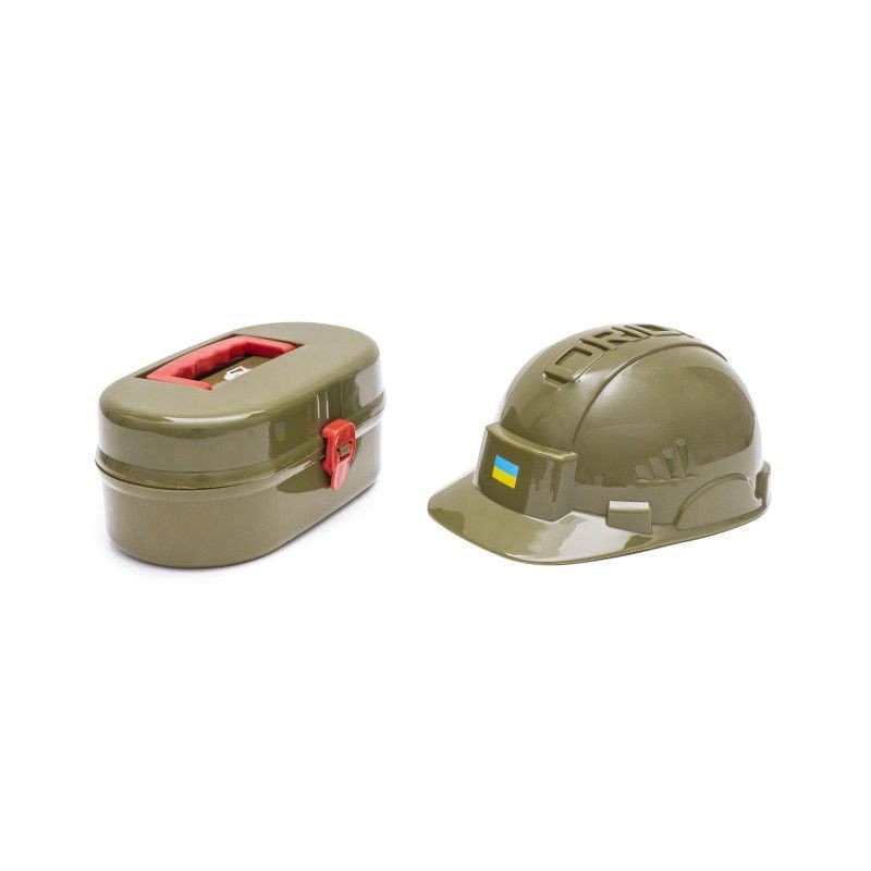 Пластиковий набір військового парамедика з каску в комплекті. Розмір каски – 24х19х13, внутрішній діаметр – 18 см. У аптечці є кисневий балон, термометр, шприц, ножиці, ложка, стетоскоп, скальпель. Набір виконаний з якісних та безпечних матеріалів
