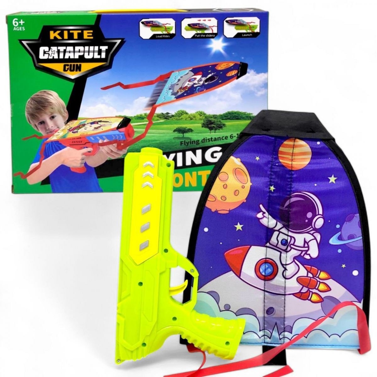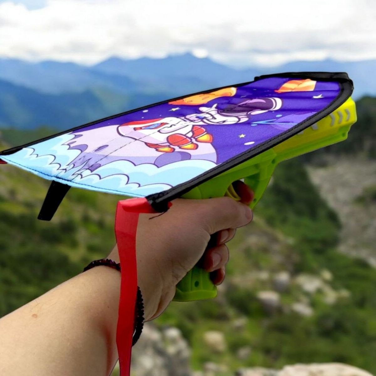 Цікава іграшка-запускалка обовʼязково порадує малюка. До комплекту входить пусковий механізм у вигляді пістолета. На пістолет встановлюється невеличкий тканинний літачок зі стрічками. Принцип роботи: літачок фіксується на пістолеті, відводиться до клацання, далі натискаєте курок - і ось ваш літак вже розсікає повітря. Розмір запускалки - 22х12,5х3,5 см; літачка - 25х20х0,2 см. Для дітей старше 6 років.