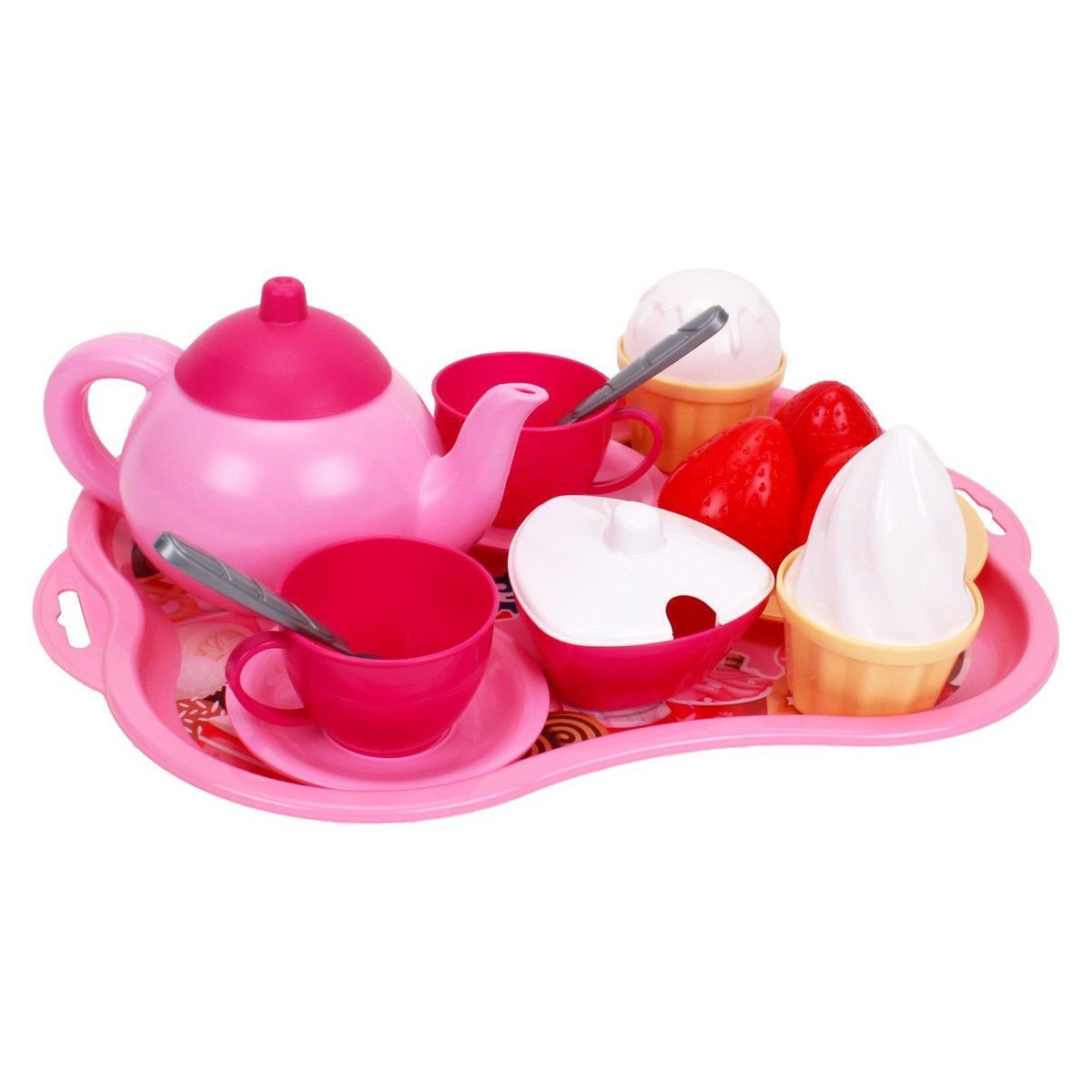 Ігровий набір пластикового посуду буде хорощие подарунком дитині. У комплекті є: таця, цукорниця з кришкою, чайник з кришкою, чашка на блюдце з ложкою - 2 шт, тарілка, полуниця 3 шт і формочки різної форми - 4 шт. Виконано з якісного пластику.