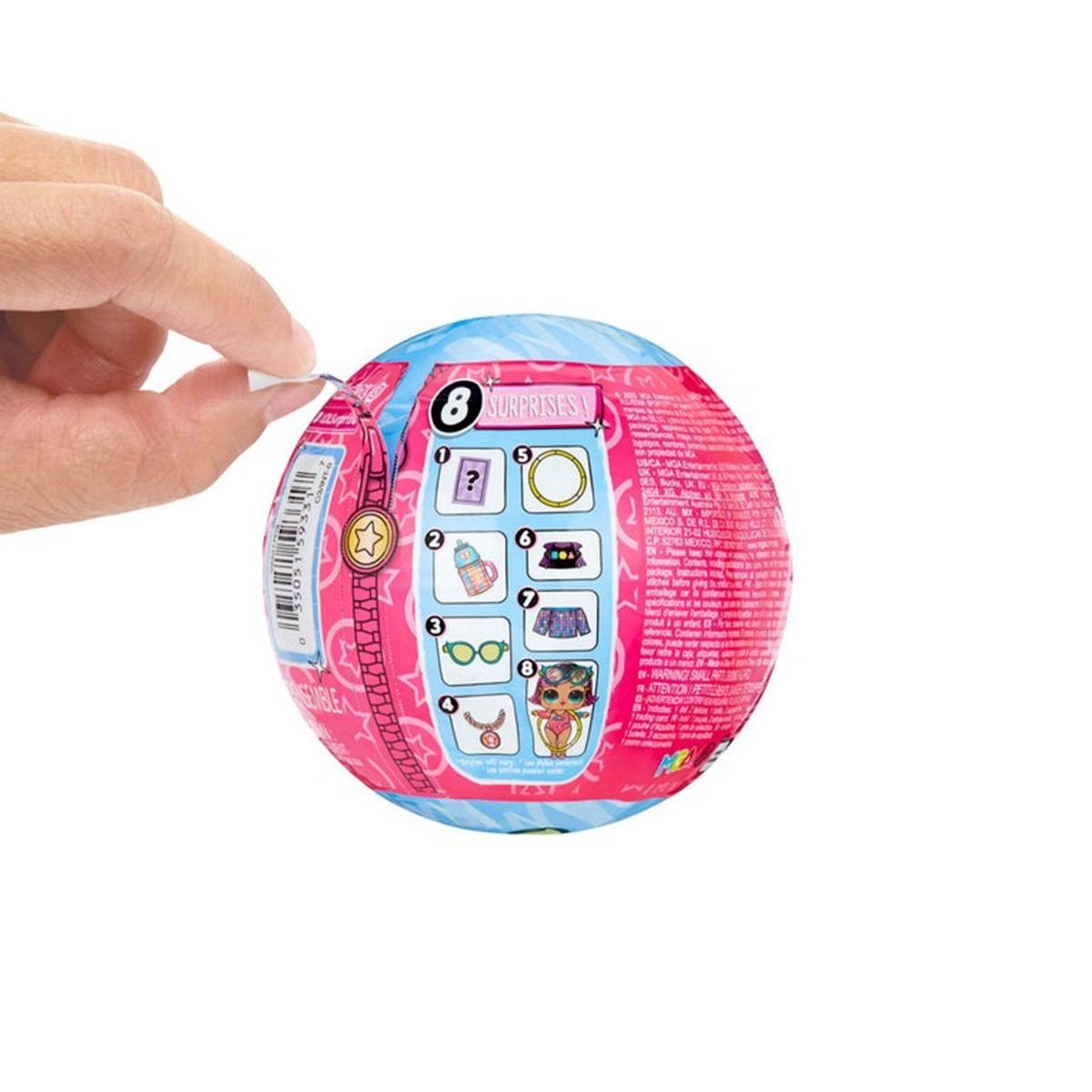 Бренд: L.O.L. Surprise! Упаковка: Куля Колір: Різнобарв'я Вага з упаковкою: 90 г Габарити в упаковці: 10 x 10 x 10 см Країна виробник: Китай Матеріал: Комбінований Комплектація: Лялька, 1-3 елементи одягу, 1 пара взуття, пляшечка, аксесуари, сумочка
