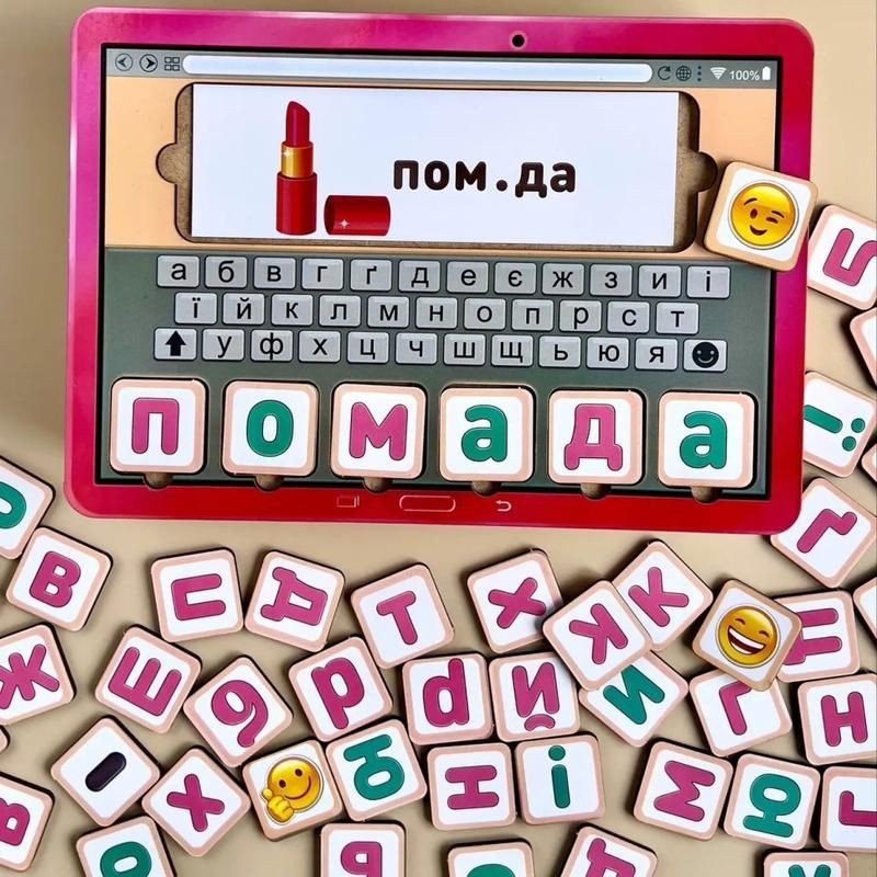 Ігровий набір "Збери слово по картинці". У комплекті є основа-планшет, 74 плашки з буквами, 2 плашки -знаки і 84 картки з картинками різної тематики. З букв збирається слово, яке випадає в ході гри на зображенні. Відмінно тренує памʼять, увагу, посидючість.