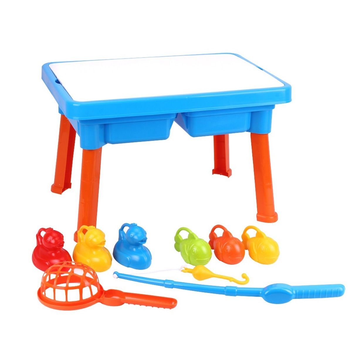 Час проведення за ігровим столиком буде захоплюючим і водночас корисним. Столик призначений для гри з піском та водою. Під робочою поверхнею міститься контейнер для зберігання. Розмір одного контейнера для зберігання 16 см. Іграшка поєднала в собі 2 функції - навчання та гру. Розмір столика - 27х43х31 см. У комплекті зі столиком-органайзиром є набір для риболовлі: вудка, сачок, 3 пластикові качки та 3 рибки. Виконано з якісного та міцного пластику. Для дітей віком від 3-х років.