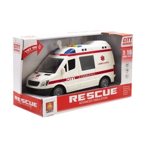 Інерційна інтерактивна машина швидкої допомоги. Має звукові і світлові ефекти. Відкриваються бічні двері і задні дверцята. Усередині салону знаходяться крісла. Виготовлена з якісного пластика. Масштаб: 1:16.