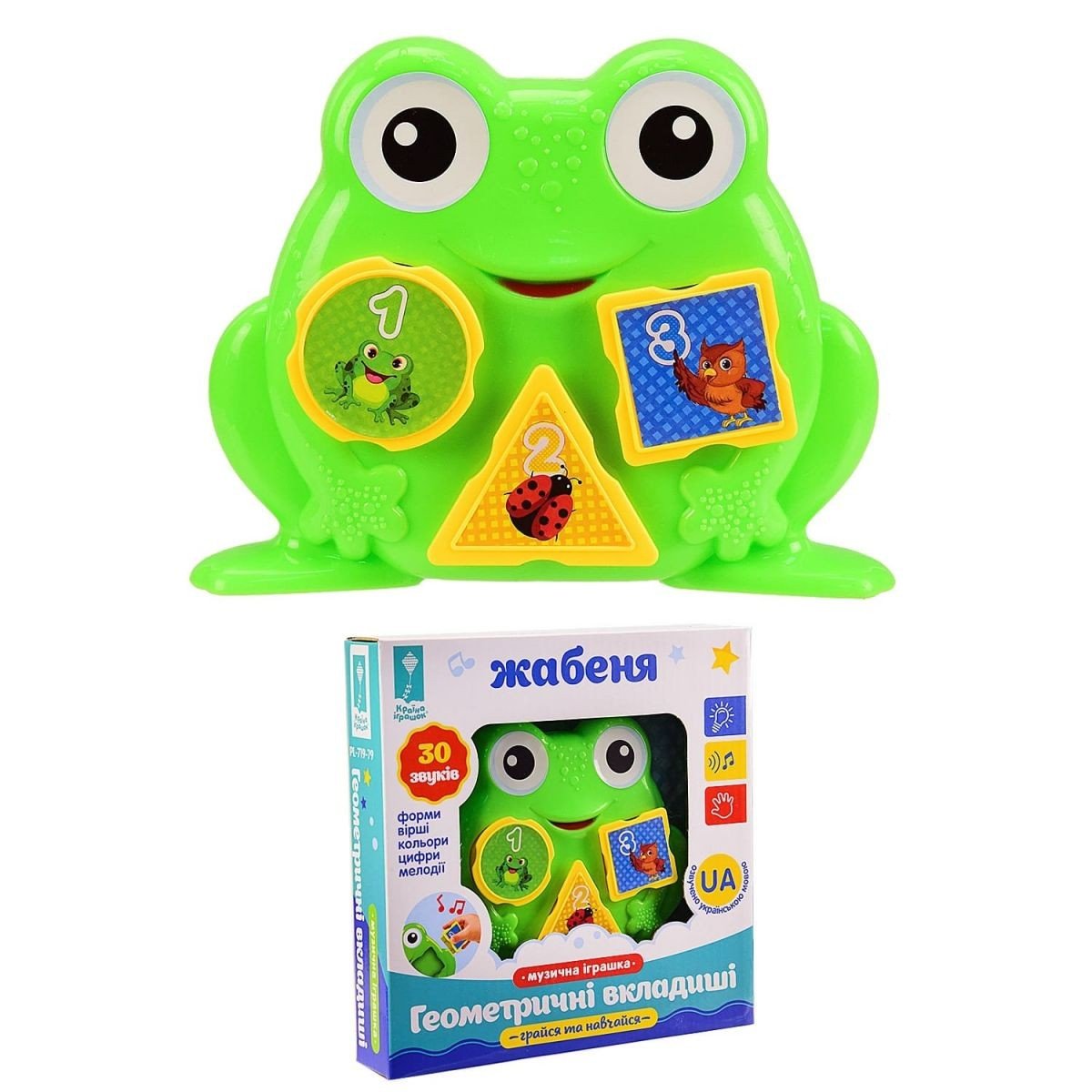 Інтерактивна іграшка буде хорошим подарунком дитині. За допомогою іграшки дитина зможе вивчити форми, кольору, цифри. Є різні віршики, пісеньки та мелодії. Так само, з іграшкою можна грати як з сортером. Підбираючи фігуркам відповідні отвори. Озвучений українською язик. Виконаний з якісного пластику.