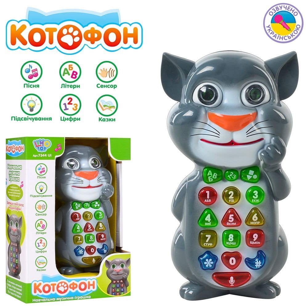 Інтерактивна іграшка "Котофон" буде цікавим подарунком дитині. У котофона є багато функцій: розповідає казки, озвучені букви і цифри, називає геометричні фігури, розповідає віршик, співає пісеньку, говорить фрази українською мовою. Так само, у іграшки є мікрофон (можна записати фрази, а котик повторить їх забавним голосом). Телефон оснащений сенсором (погладивши котика по голові, можна почути казку чи пісеньку; котик починає говорити, якщо доторкнутися до його щічки). Розмір іграшки - 15х8 см.