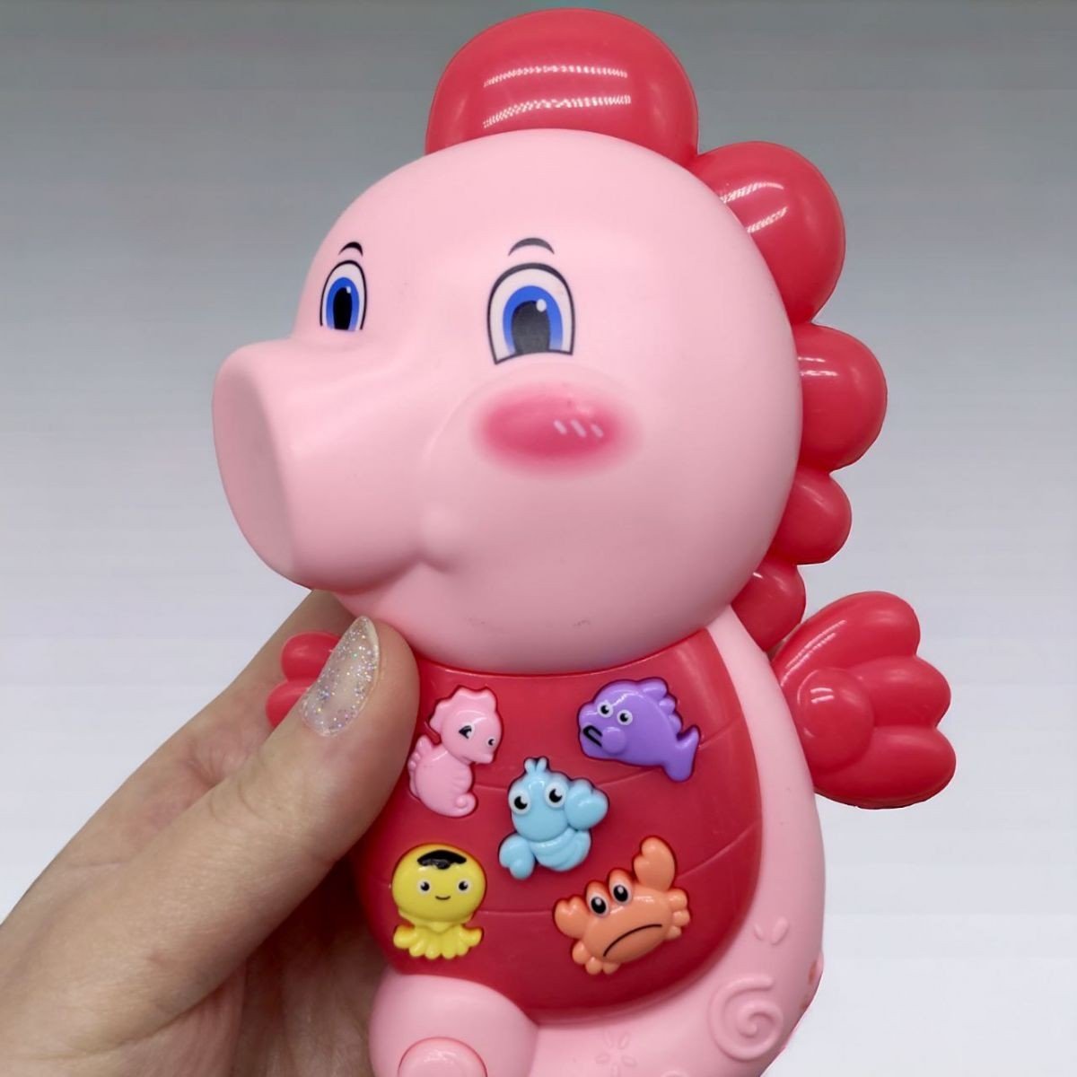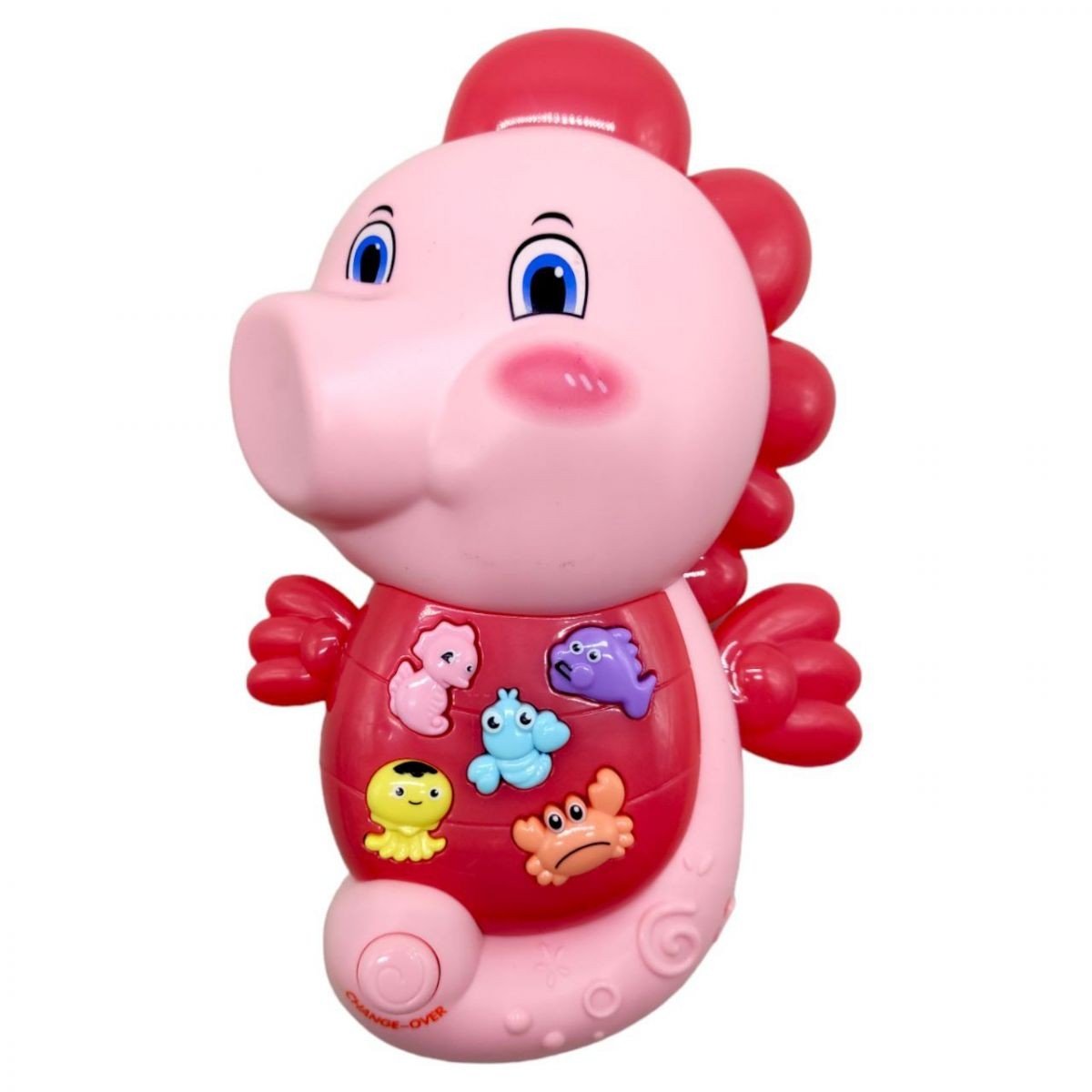 Цікава інтерактивна іграшка у вигляді морського коника. На пузику коника розміщені 5 кнопок у вигляді морських мешканців. Натискаючи на кожну з кнопок можна почути кумедний звук або мелодію (в залежності від обраного режиму). Кнопка-перемикач режимів знаходиться на хвості коника. Також у даної іграшки можна регулювати гучність. Розмір - 17х10х4,5 см. Працює від 3-х батарейок ААА (до комплекту не входять).