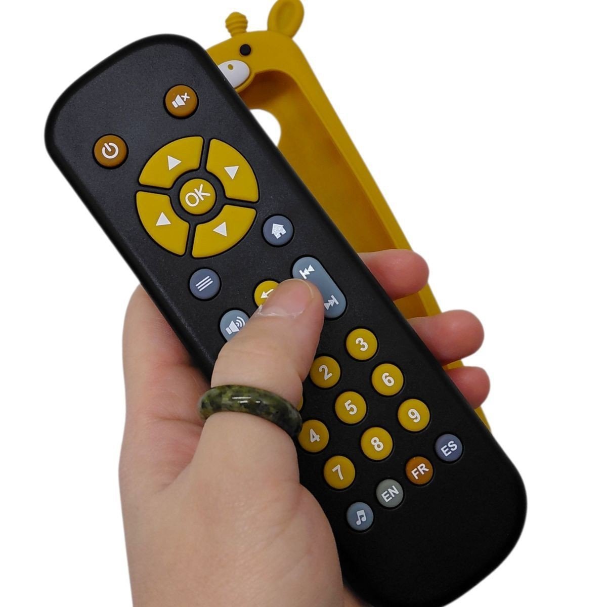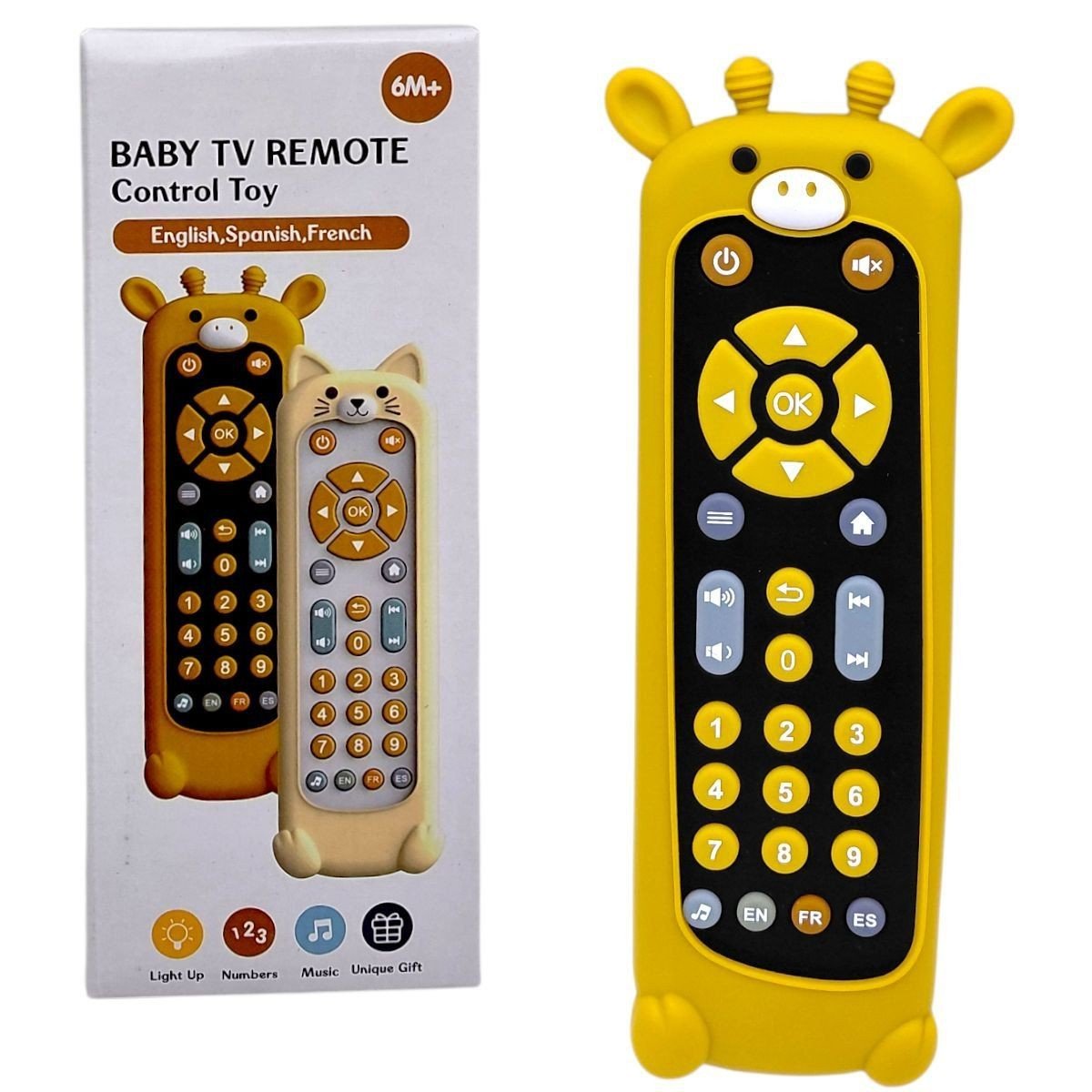 Кумедний ігровий пульт допоможе малюкові весело вивчати звуки, мелодії, мови та цифри. Завдяки підсвічуванню як у справжньому пульті, музичним режимам та різним мовам озвучування дитина із захопленням натискатиме кнопочки, вивчатиме нові звуки та повторюватиме цифри. Мʼякі гумові кнопки зручні для маленьких пальчиків, а яскравий дизайн робить гру ще приємнішою. Такий пульт відмінно підходить для розвитку сенсорики, уваги та раннього навчання. Озвучування цифр англійською, іспанською та французькою мовами; Розмір пульта: 5,5 х17 см; Кнопка з нотою слугує перемикачем режимів звуку; Поміщений у гумовий чохол у вигляді звірятка. Працює від 2 батарейок типу ААА (у комплект не входять).