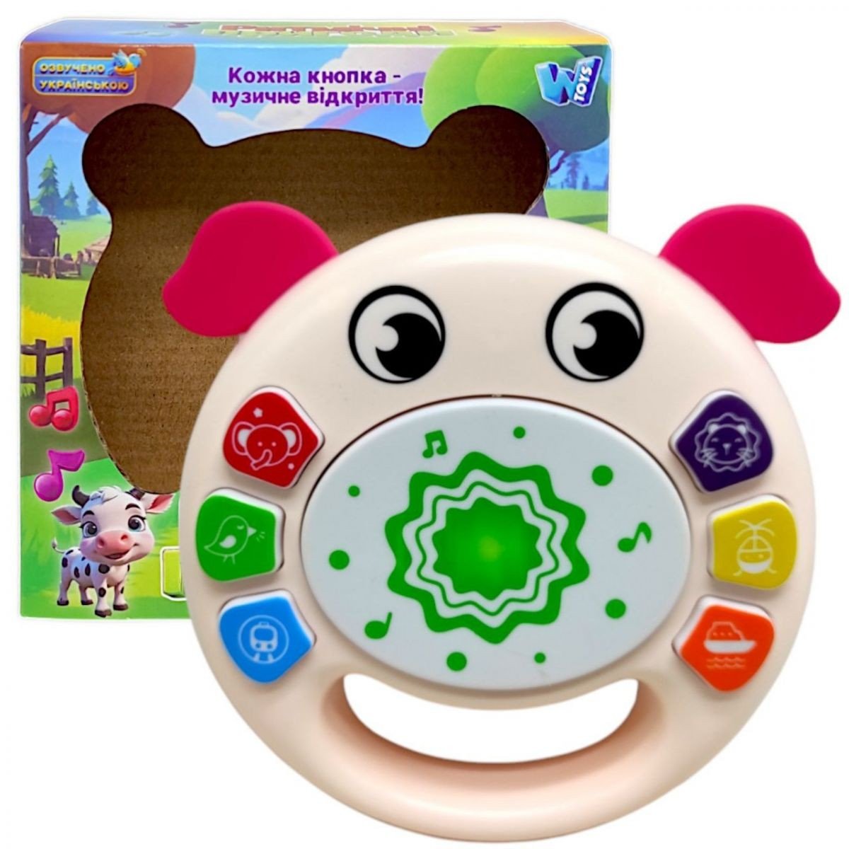 "Ритмічні пригоди" — це захоплююча музична іграшка, створена для найменших дослідників. Вона знайомить дитину зі звуками тварин і транспорту, вчить віршики та розповідає казки. Центральним елементом іграшки є барабан, який дозволяє малечі створювати веселі ритми, натискаючи на тематичні кнопки.Іграшка виготовлена у формі милої тваринки та озвучена українською мовою. Вона виконує пісні, відтворює різноманітні звуки й сприяє розвитку музичних здібностей дитини. Компактні розміри (12х3,5х13,5 см) забезпечують зручність у використанні, а матеріал — міцний первинний пластик — гарантує довговічність. Працює на трьох батарейках типу AAA (не входять до комплекту). Для дітей старше 6 місяців.