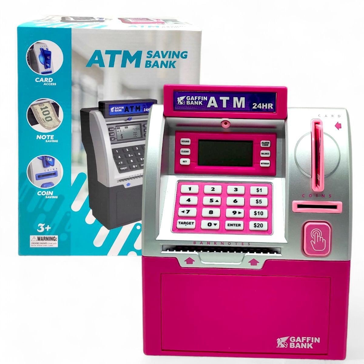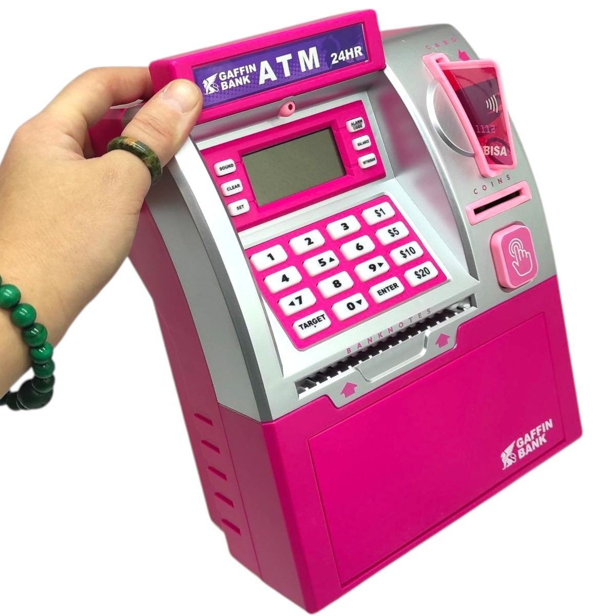 Ця цікава та багатофункціональна скарбничка надійно збереже фінанси вашого малюка! Іграшка є стилізованою під банкомат, а до набору навіть додано іграшкові гроші та банківську карту. Так ваша дитина навчиться відповідально ставитися до грошей та отримає основи навичок користування банкоматом. В комплекті присутня інструкція англійською мовою, з попроковими інструкціями того як працюють функції банкомата. Дефолтним паролем для відкриття сейфа є 0000. Іграшка підсвічується та має звукові ефекти для кожного натискання на кнопку, ніби справжній банкомат.