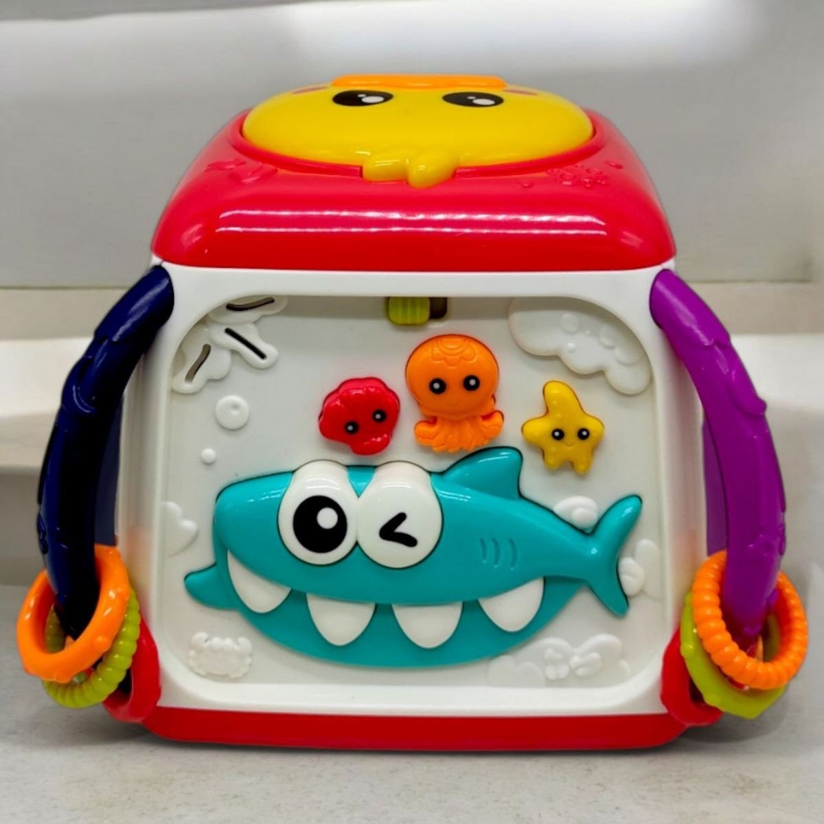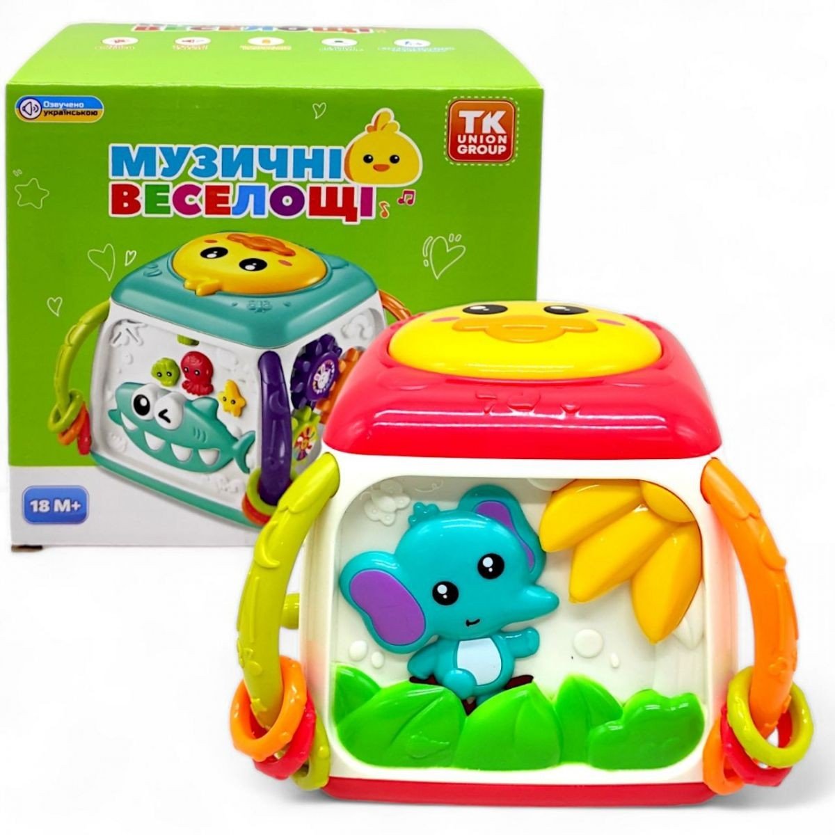 Інтерактивний мультибокс "Музичні веселощі" — це яскрава та цікава іграшка у вигляді кубика, на кожній грані якого є різні ігри для розвитку дитини. На двох гранях розташовані пальчикові ігри, на інших — рухливі шестерні та морські мешканці, які співають, розповідають казки та мелодії. Особливо цікава сторона з акулою, де можна порахувати її зуби. Іграшка також має качечку зверху, яка відтворює звуки барабанів і підсвічується. Працює від 3 батарейок типу AA (немає в комплекті). Допомагає розвивати моторику, зір, слух і координацію. Українською мовою.