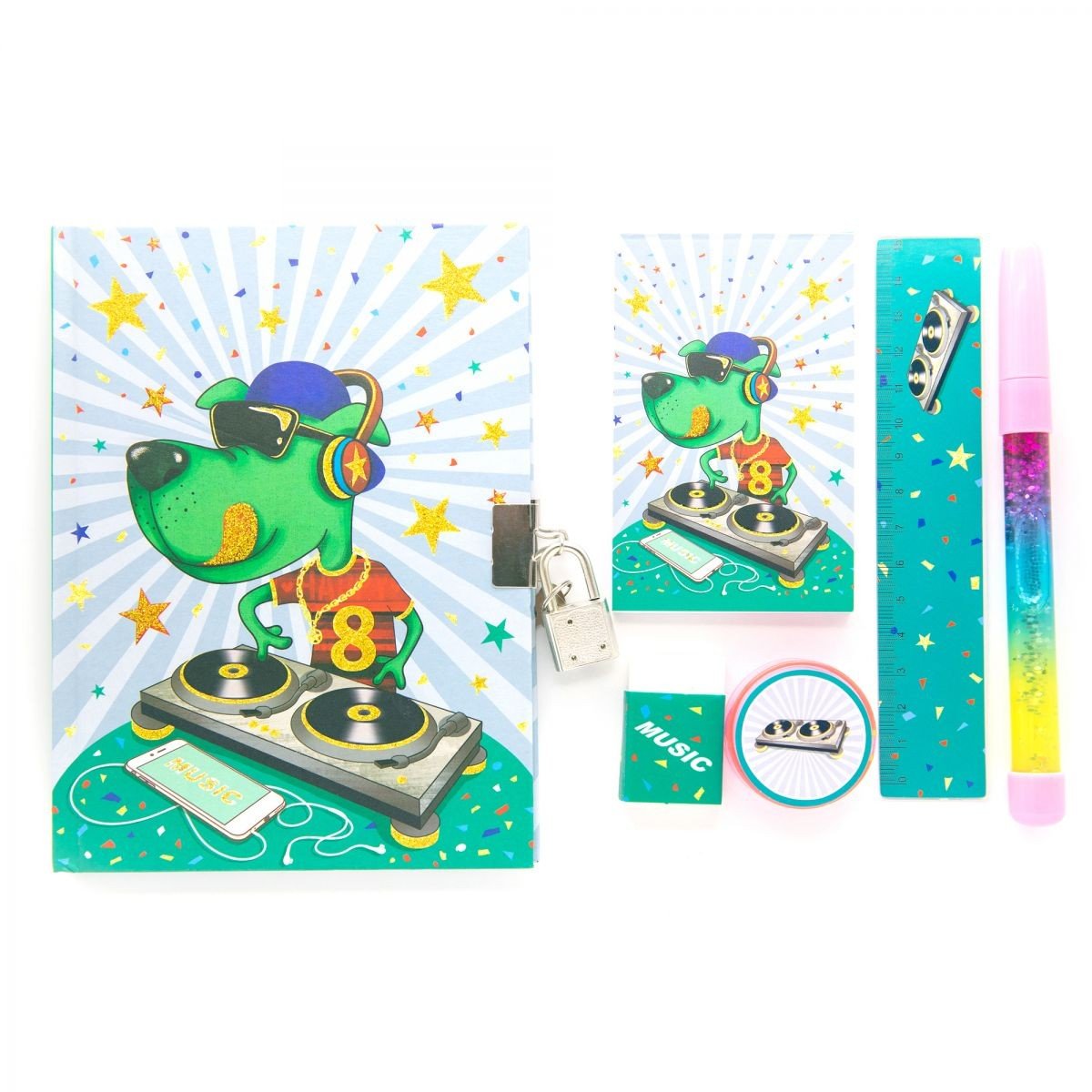 Подарунковий канцелярський набір включає: милий блокнот в лінію на замку, ключики, міні-блокнот з чистими листами, ручка з блискітками всередині, точилка, гумка і лінійка на 15 см. Набір виконаний з якісних і безпечних матеріалів.