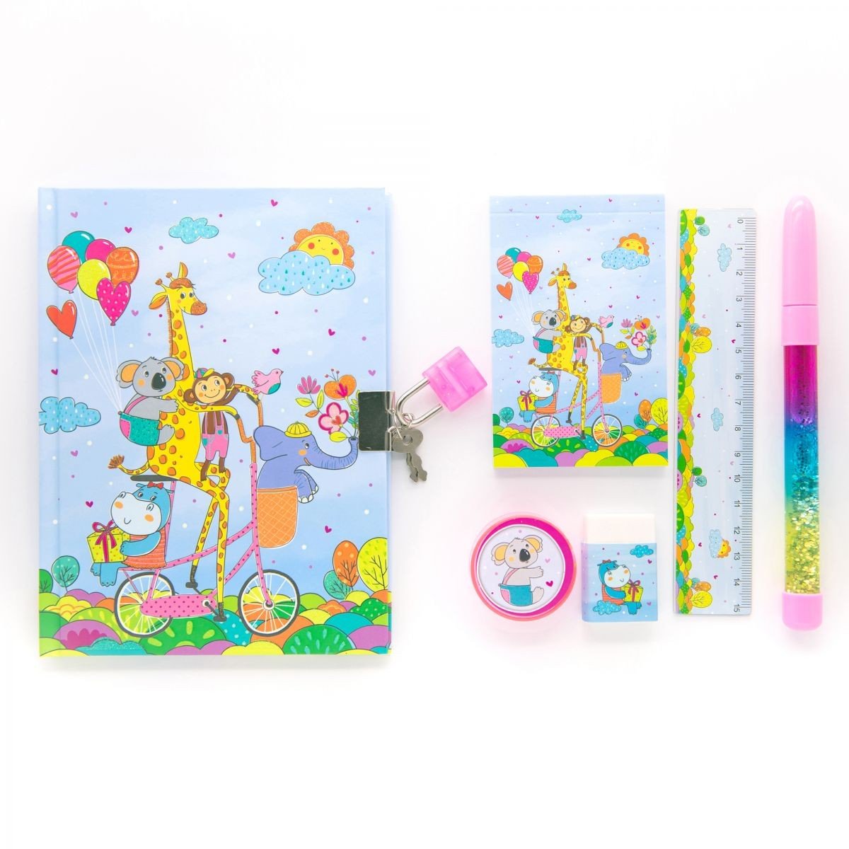 Подарунковий канцелярський набір включає: милий блокнот в лінію на замку, ключики, міні-блокнот з чистими листами, ручка з блискітками всередині, точилка, гумка і лінійка на 15 см. Набір виконаний з якісних і безпечних матеріалів.