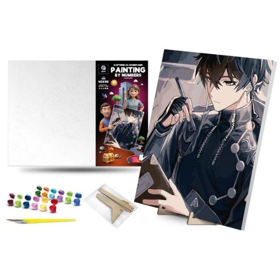 Дитяча картина за номерами. Для того, щоб намалювати картину, необхідно малювати за пронумерованими контурами, які відповідають кольору фарби. У наборі: полотно на підрамнику з галерейною натяжкою, художні нейлонові пензлі, палітра акрилових фарб у контейнерах, деревʼяні деталі підставки для картини. Усі необхідні фарби вже в комплекті та не вимагають змішування. Розмір: 4050 см. Рекомендовано для дітей старше 5 років.