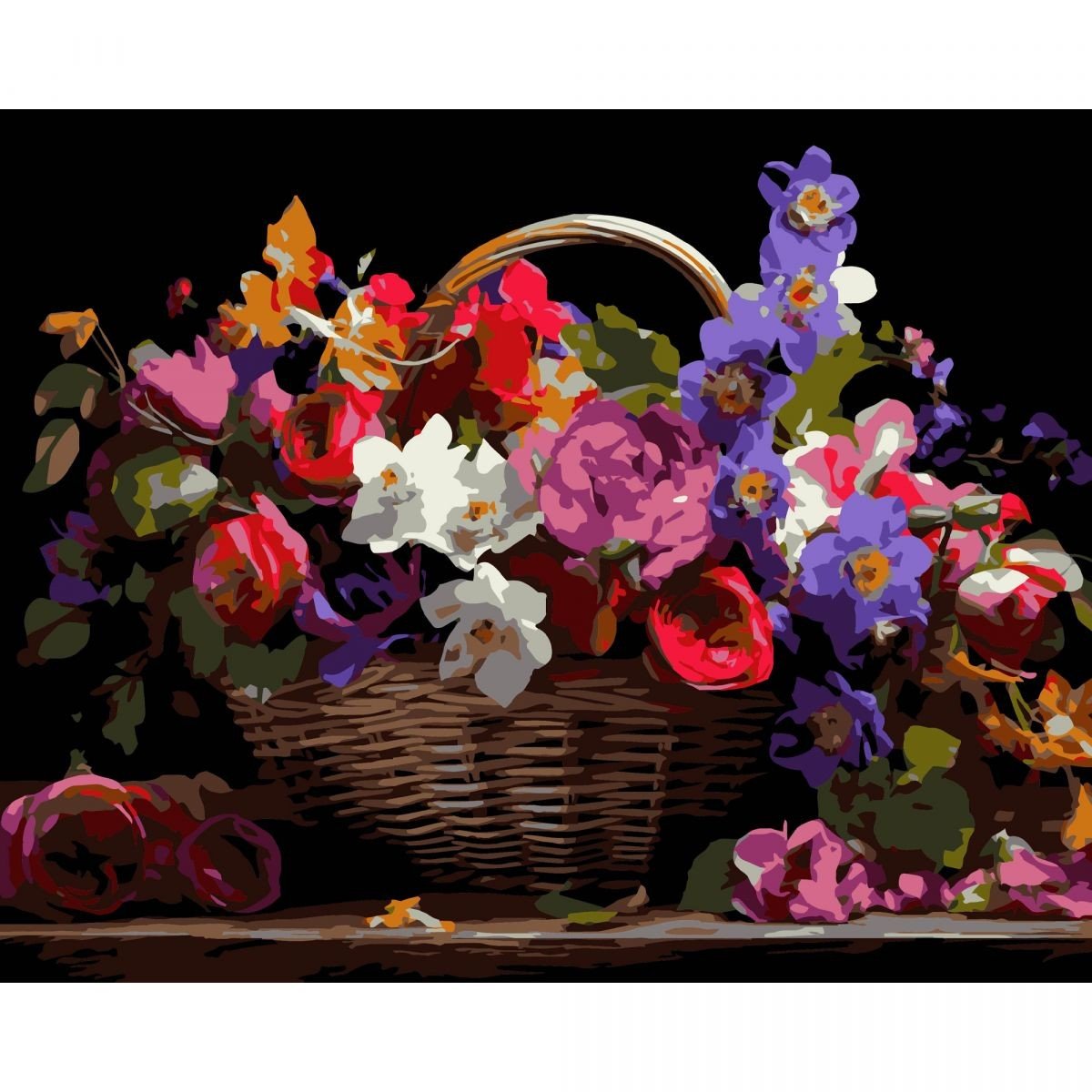 Опис Картина по номерах на чорному фоні "Кошик різнокольорових квітів" 40х50 см