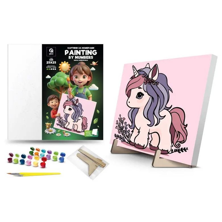 Дитяча картина за номерами. Для того, щоб намалювати картину, необхідно малювати за пронумерованими контурами, які відповідають кольору фарби. У наборі: полотно на підрамнику з галерейною натяжкою, художні нейлонові пензлі, палітра акрилових фарб у контейнерах, деревʼяні деталі підставки для картини. Усі необхідні фарби вже в комплекті та не вимагають змішування. Розмір: 25х25 см. Рекомендовано для дітей старше 5 років.