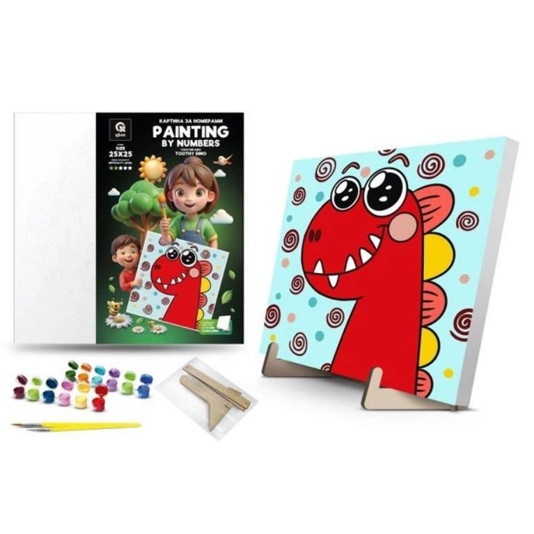 Опис Картина по номерах "Зубатий Діно" (25х25 см) з деревʼяною підставкою